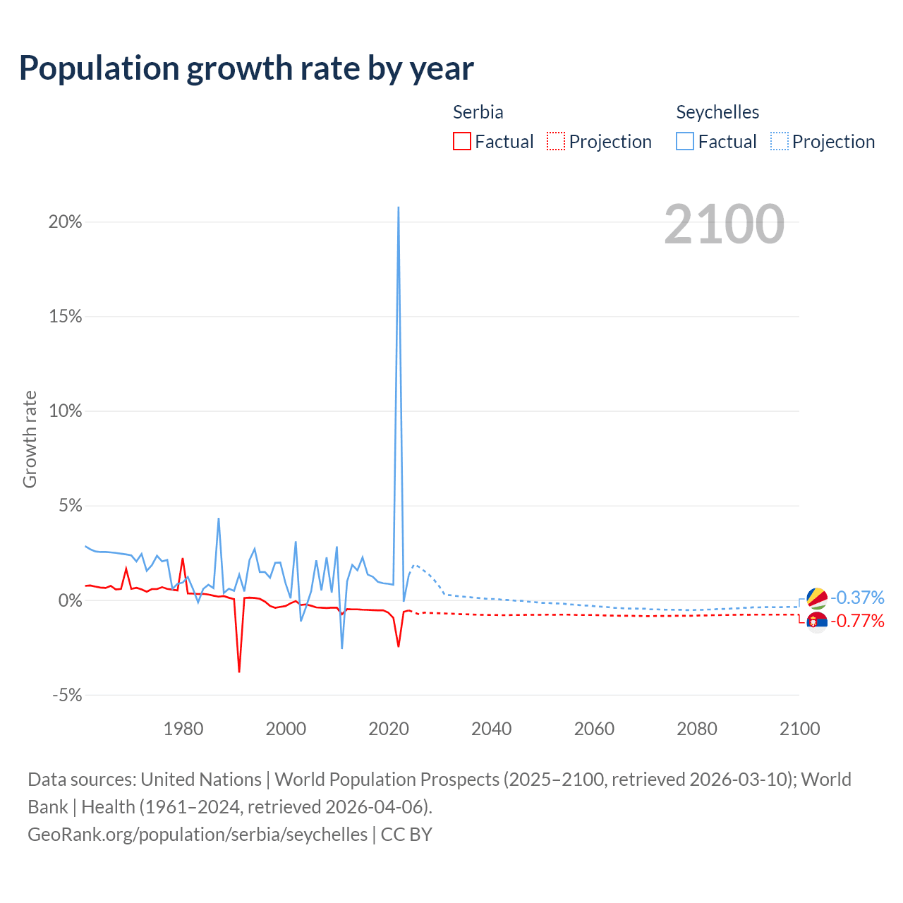 - For the last 10 years, Serbia has had an average growth rate of -0.76% per year vs +2.9% in the Seychelles.