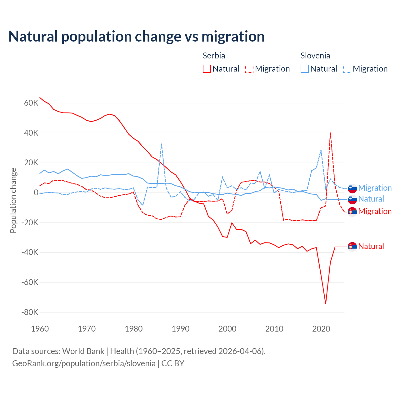 Over the last 10 years, 83.3% of the population change in Serbia is from natural causes (a loss of 435,148 people) and 16.7% is from migration (a loss of 87,110 people). In Slovenia 18.1% is from natural causes (a loss of 17,573 people) and 81.9% is from migration (a gain of 79,532 people).
