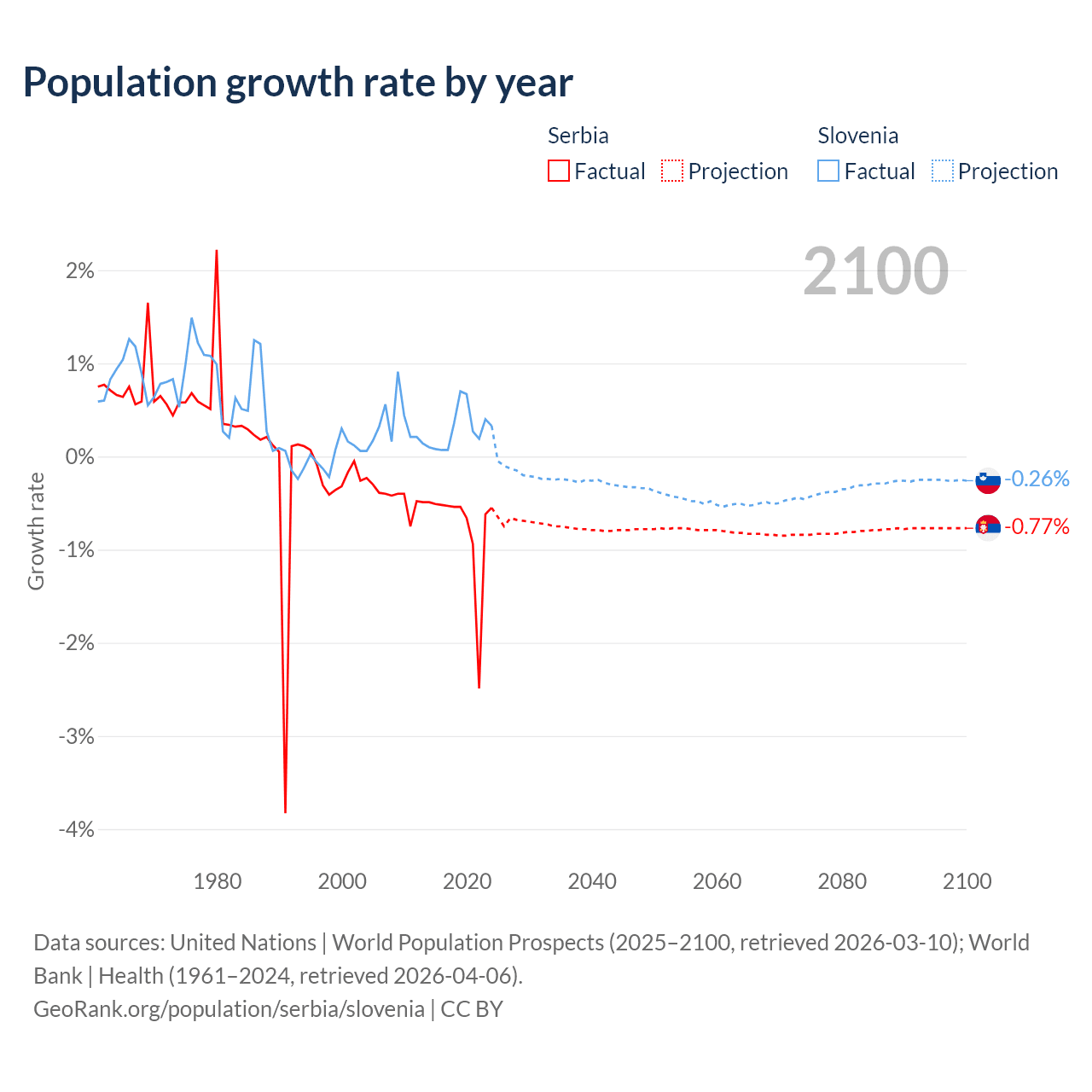 - For the last 10 years, Serbia has had an average growth rate of -0.76% per year vs +0.29% in Slovenia.