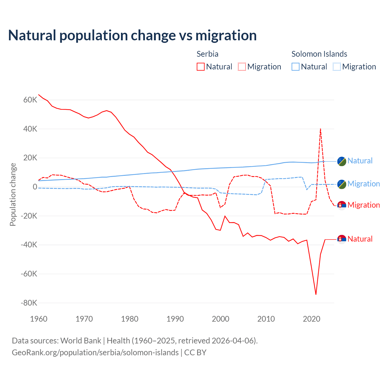Over the last 10 years, 83.3% of the population change in Serbia is from natural causes (a loss of 435,148 people) and 16.7% is from migration (a loss of 87,110 people). In the Solomon Islands 82.8% is from natural causes (a gain of 168,727 people) and 17.2% is from migration (a gain of 35,031 people).