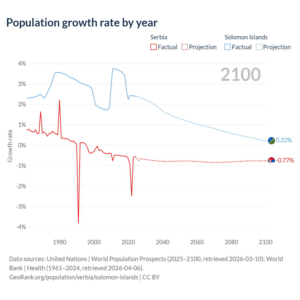 - For the last 10 years, Serbia has had an average growth rate of -0.76% per year vs +2.95% in the Solomon Islands.