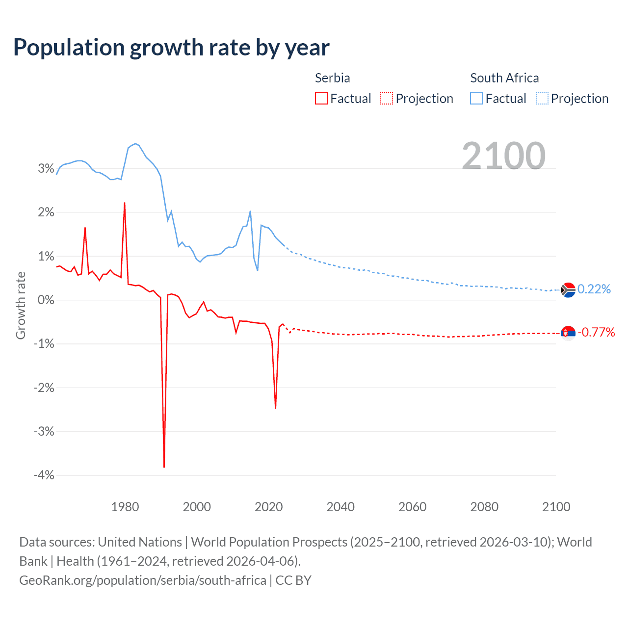 - For the last 10 years, Serbia has had an average growth rate of -0.76% per year vs +1.44% in South Africa.