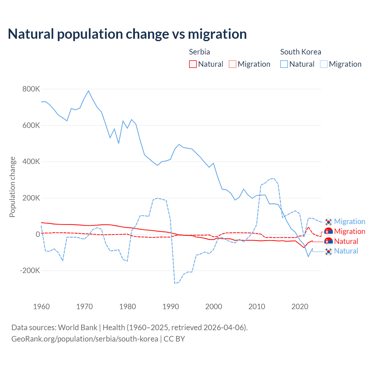 Over the last 10 years, 83.3% of the population change in Serbia is from natural causes (a loss of 435,148 people) and 16.7% is from migration (a loss of 87,110 people). In South Korea 17.6% is from natural causes (a gain of 277,215 people) and 82.4% is from migration (a gain of 1,298,356 people).