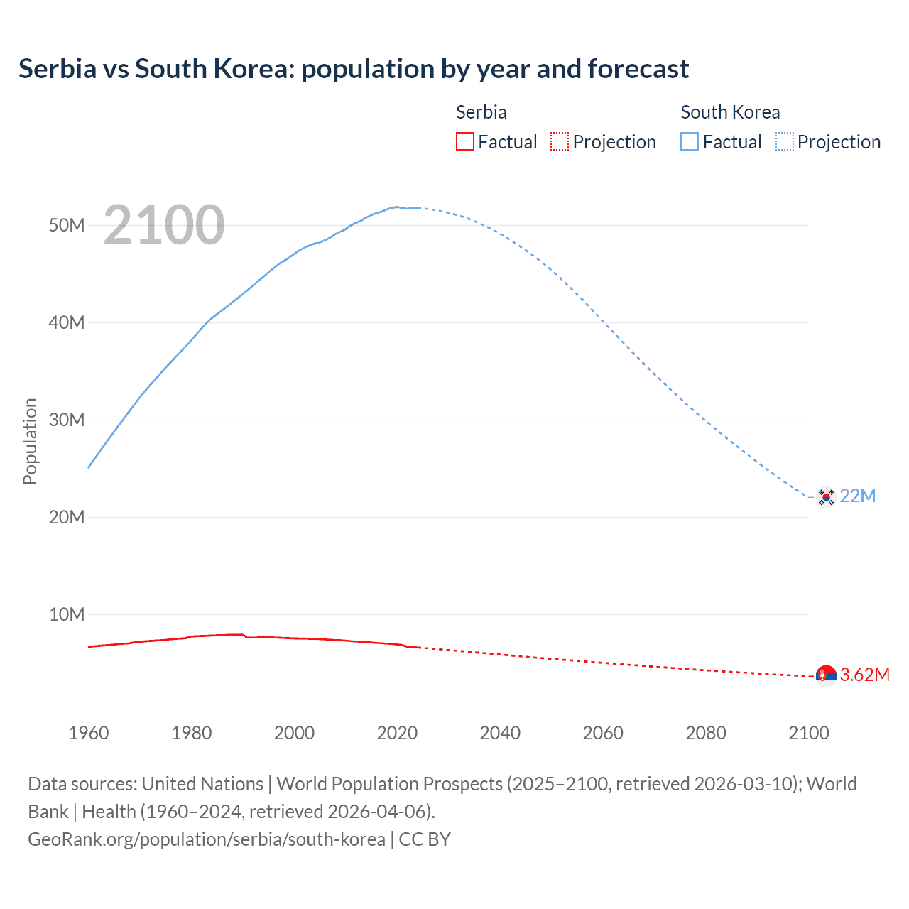 Serbia vs South Korea: population by year and forecast