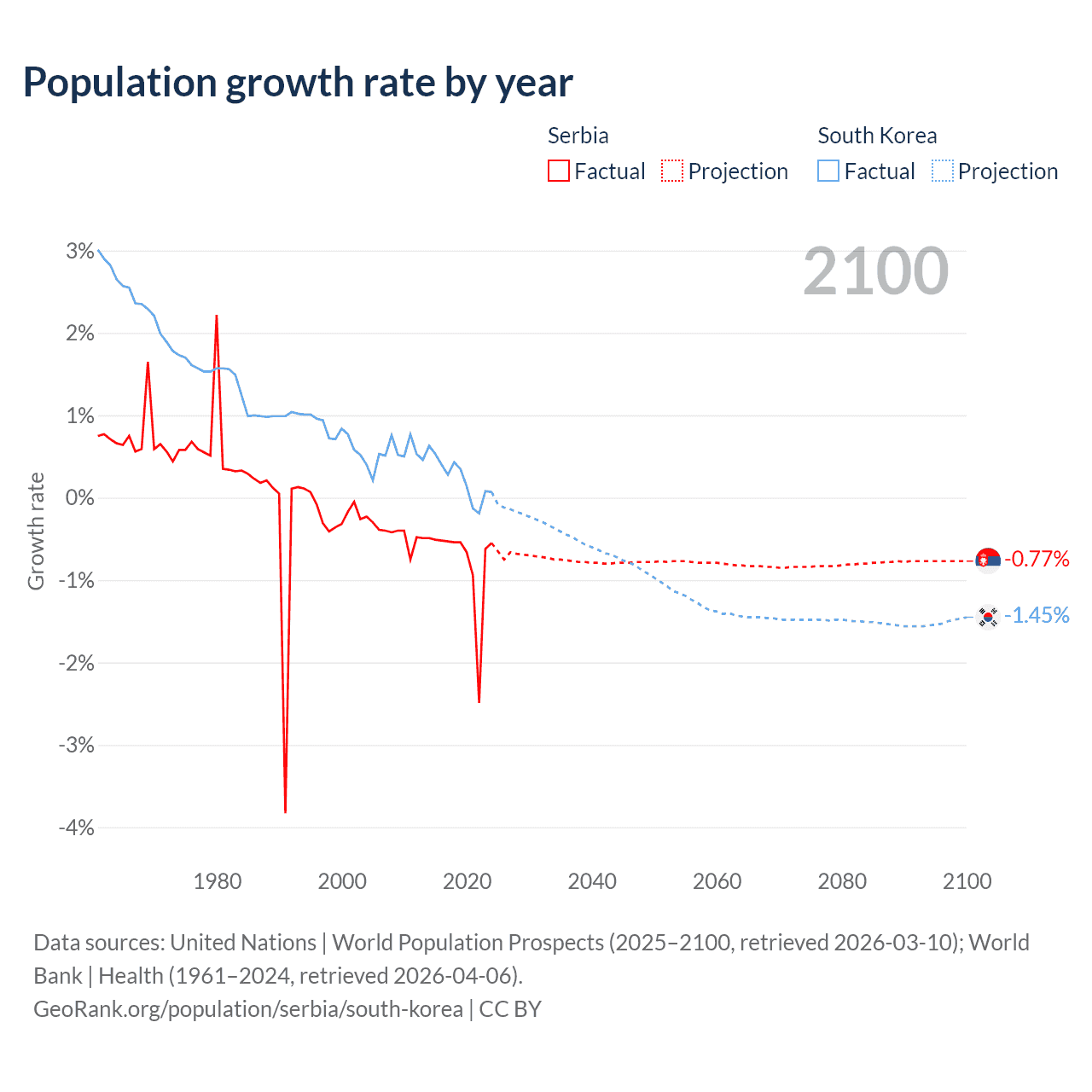 - For the last 10 years, Serbia has had an average growth rate of -0.76% per year vs +0.24% in South Korea.