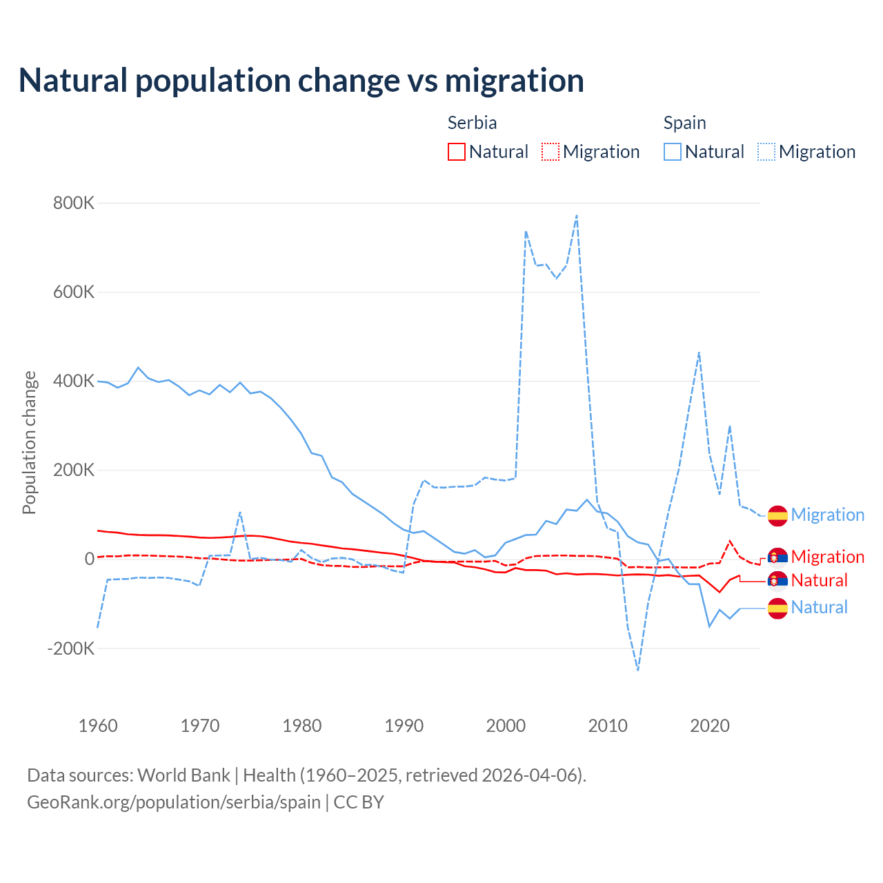 Over the last 10 years, 83.3% of the population change in Serbia is from natural causes (a loss of 435,148 people) and 16.7% is from migration (a loss of 87,110 people). In Spain 25.8% is from natural causes (a loss of 627,829 people) and 74.2% is from migration (a gain of 1,810,127 people).