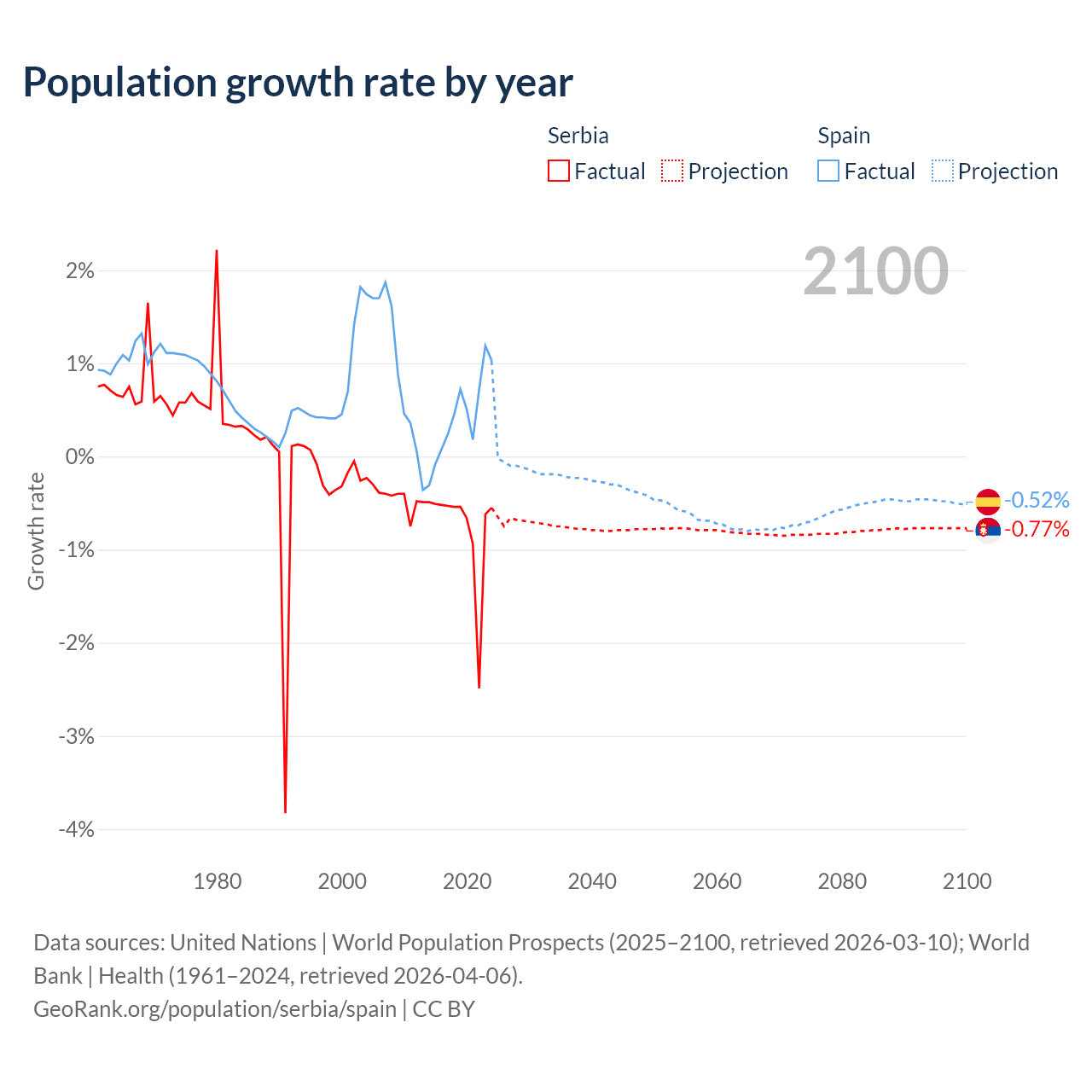 - For the last 10 years, Serbia has had an average growth rate of -0.76% per year vs +0.43% in Spain.