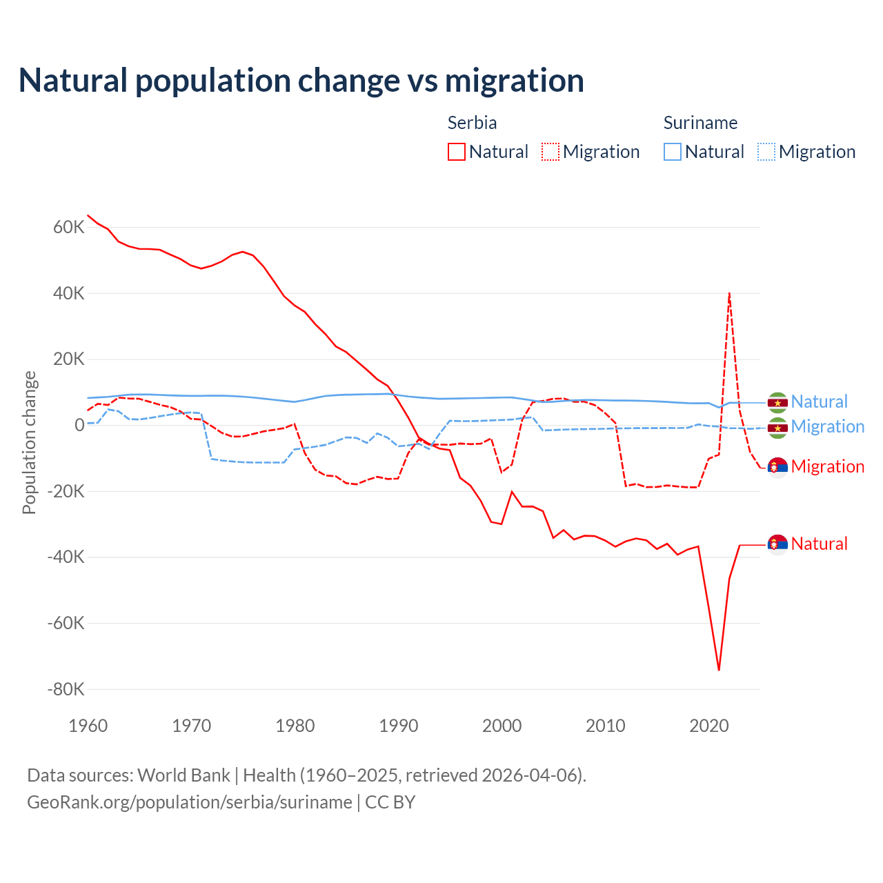 Over the last 10 years, 83.3% of the population change in Serbia is from natural causes (a loss of 435,148 people) and 16.7% is from migration (a loss of 87,110 people). In Suriname 90.3% is from natural causes (a gain of 66,709 people) and 9.72% is from migration (a loss of 7,185 people).