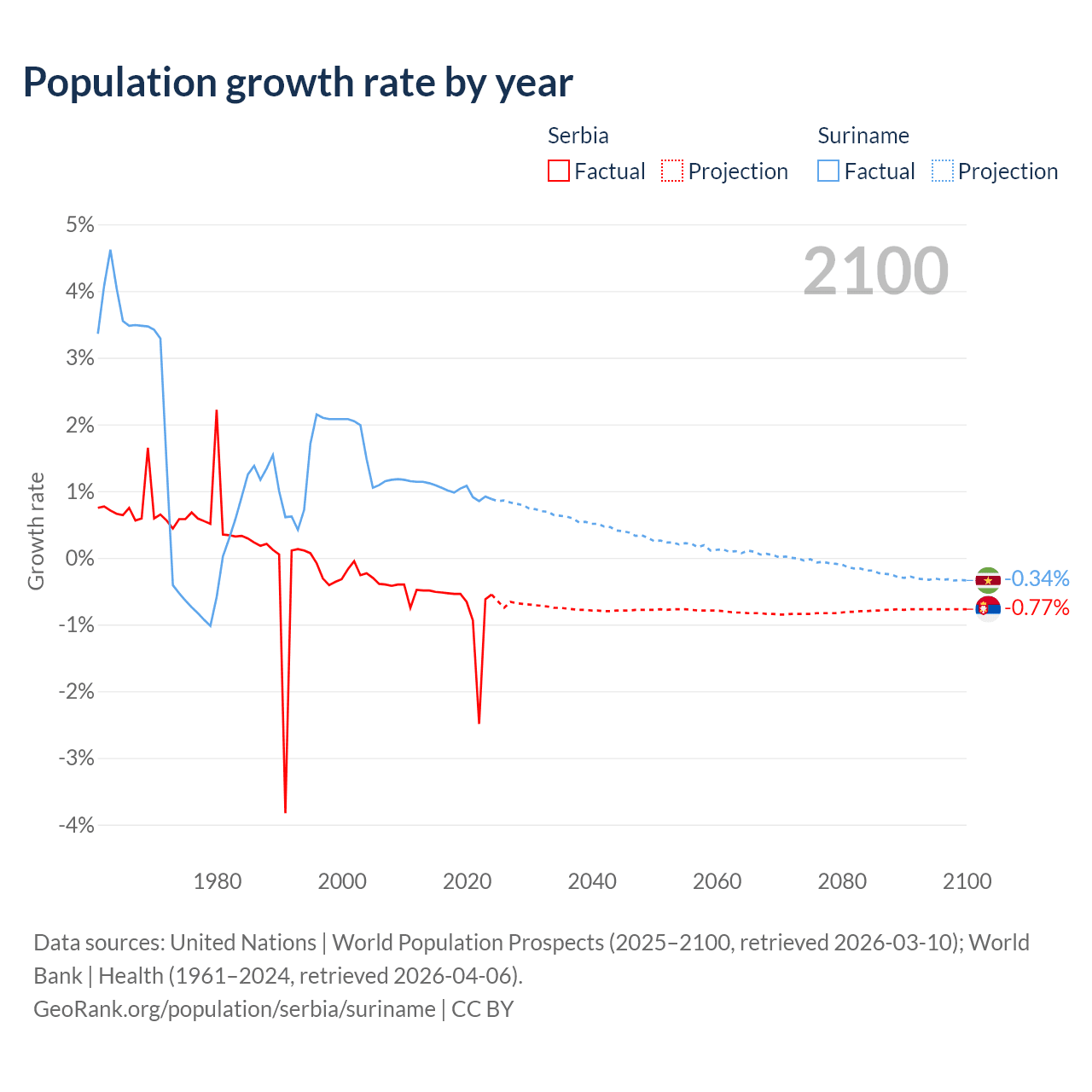 - For the last 10 years, Serbia has had an average growth rate of -0.76% per year vs +0.99% in Suriname.