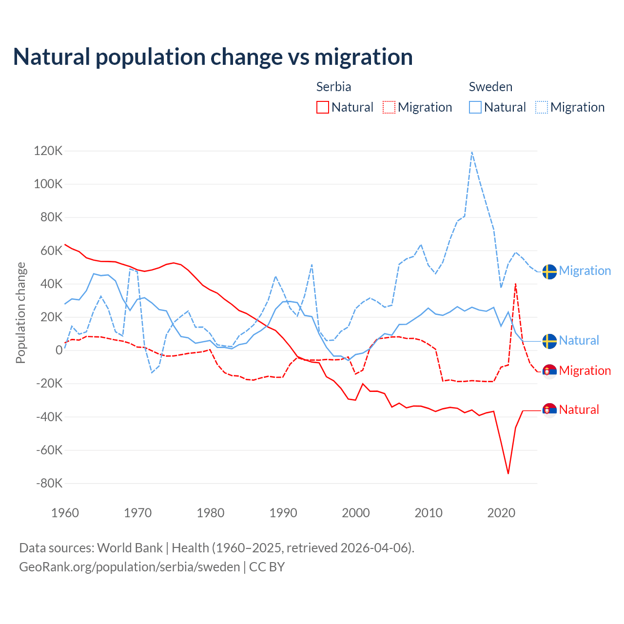 Over the last 10 years, 83.3% of the population change in Serbia is from natural causes (a loss of 435,148 people) and 16.7% is from migration (a loss of 87,110 people). In Sweden 21.4% is from natural causes (a gain of 201,900 people) and 78.6% is from migration (a gain of 743,642 people).
