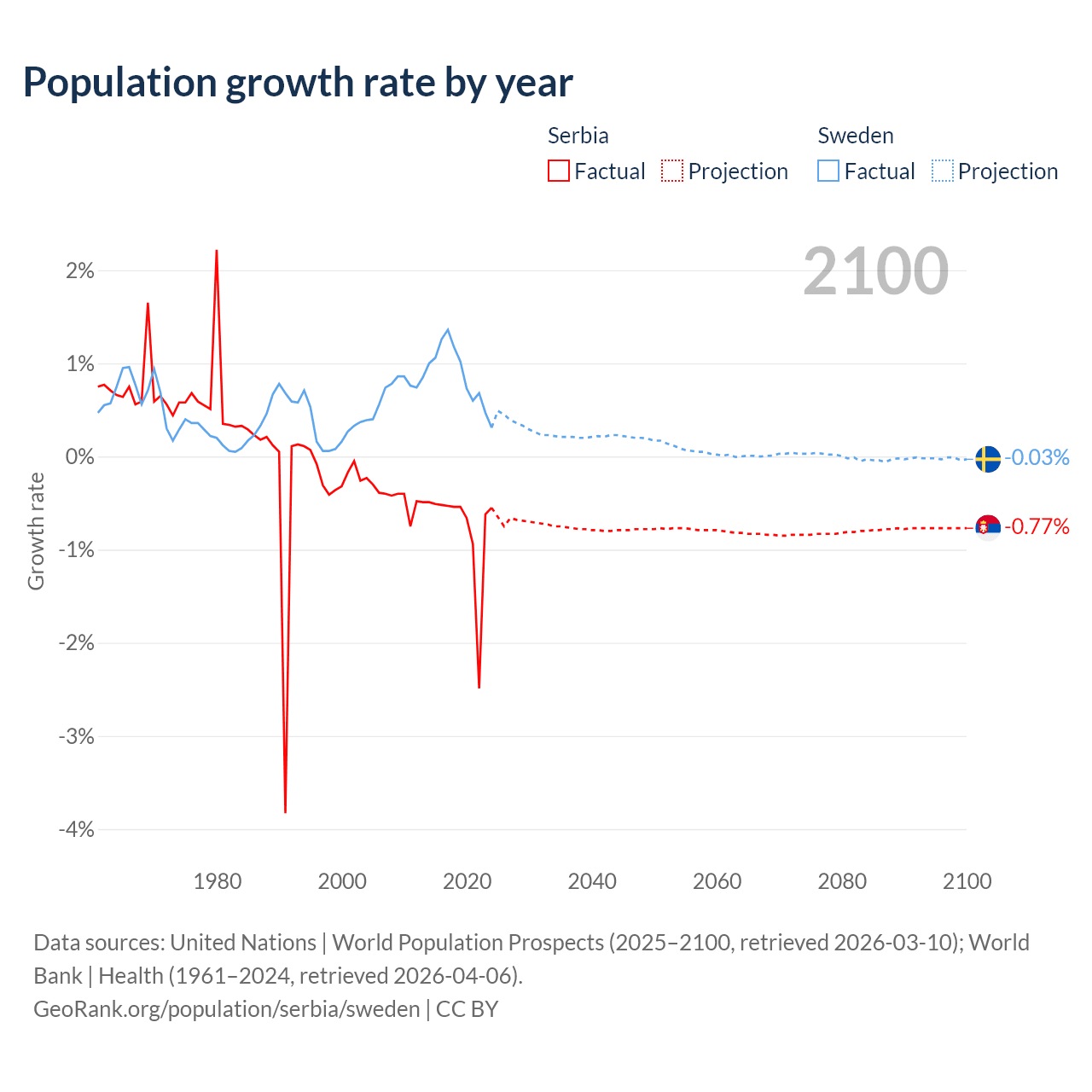 - For the last 10 years, Serbia has had an average growth rate of -0.76% per year vs +0.88% in Sweden.