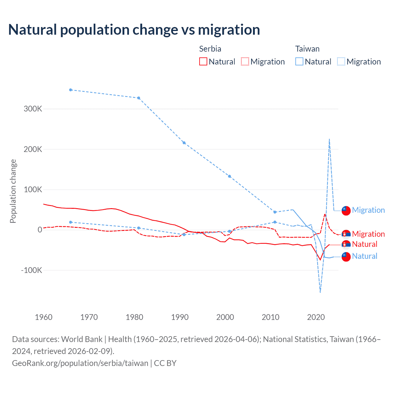 Over the last 10 years, 83.3% of the population change in Serbia is from natural causes (a loss of 435,148 people) and 16.7% is from migration (a loss of 87,110 people). In Taiwan 56.7% is from natural causes (a loss of 57,467 people) and 43.3% is from migration (a gain of 43,884 people).