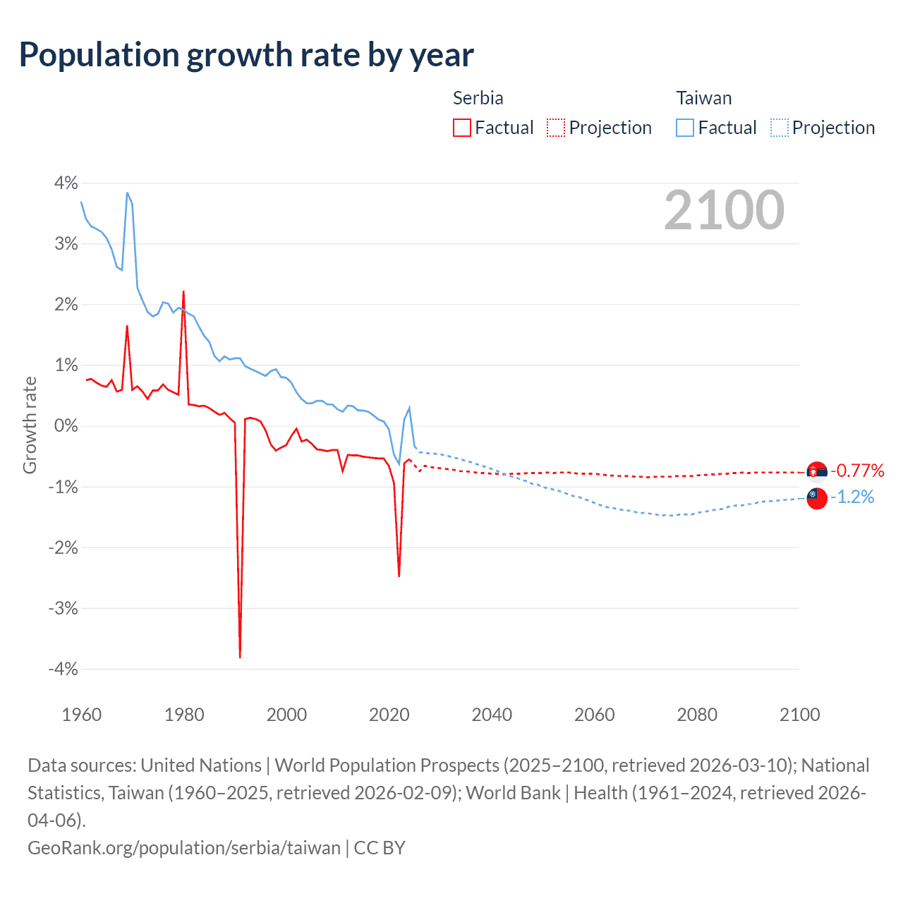Data sources: World Bank | Health (1960–2024, retrieved 2026-04-06); United Nations | World Population Prospects (1960–2026, retrieved 2026-03-10); U.S. Census Bureau (1960–2025, retrieved 2026-02-08); National Statistics, Taiwan (1960–2025, retrieved 2026-02-09); Central Intelligence Agency (CIA) (2000–2019, retrieved 2026-02-20).