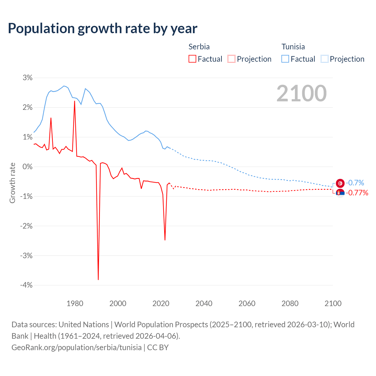 - For the last 10 years, Serbia has had an average growth rate of -0.76% per year vs +0.89% in Tunisia.