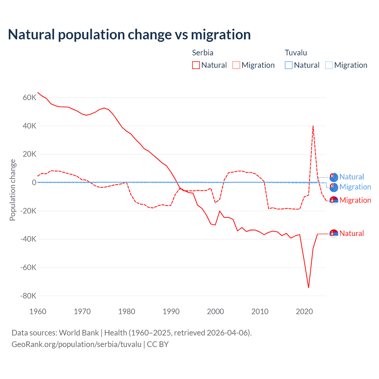 Over the last 10 years, 83.3% of the population change in Serbia is from natural causes (a loss of 435,148 people) and 16.7% is from migration (a loss of 87,110 people). In Tuvalu 35.5% is from natural causes (a gain of 1,556 people) and 64.5% is from migration (a loss of 2,827 people).