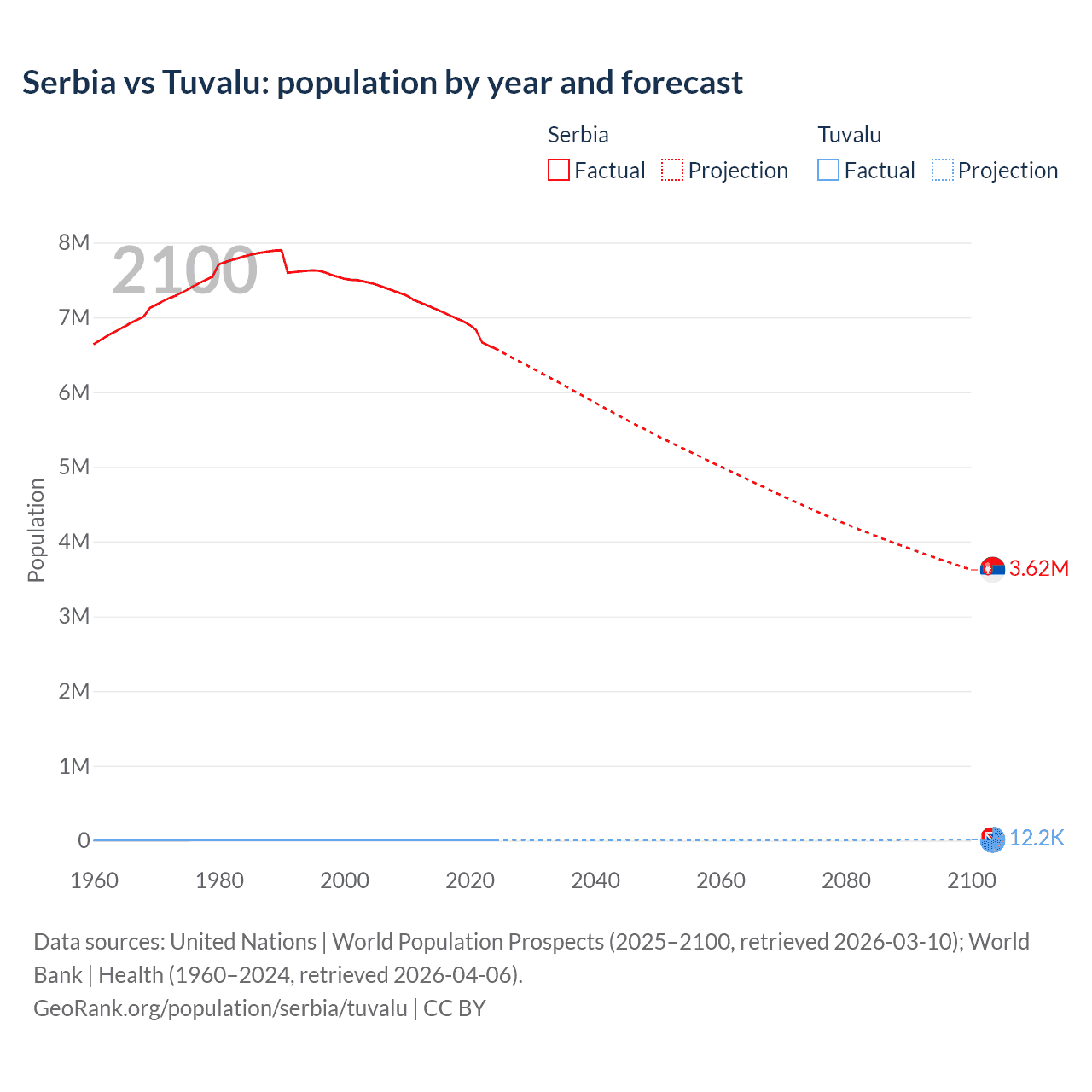 Serbia vs Tuvalu: population by year and forecast