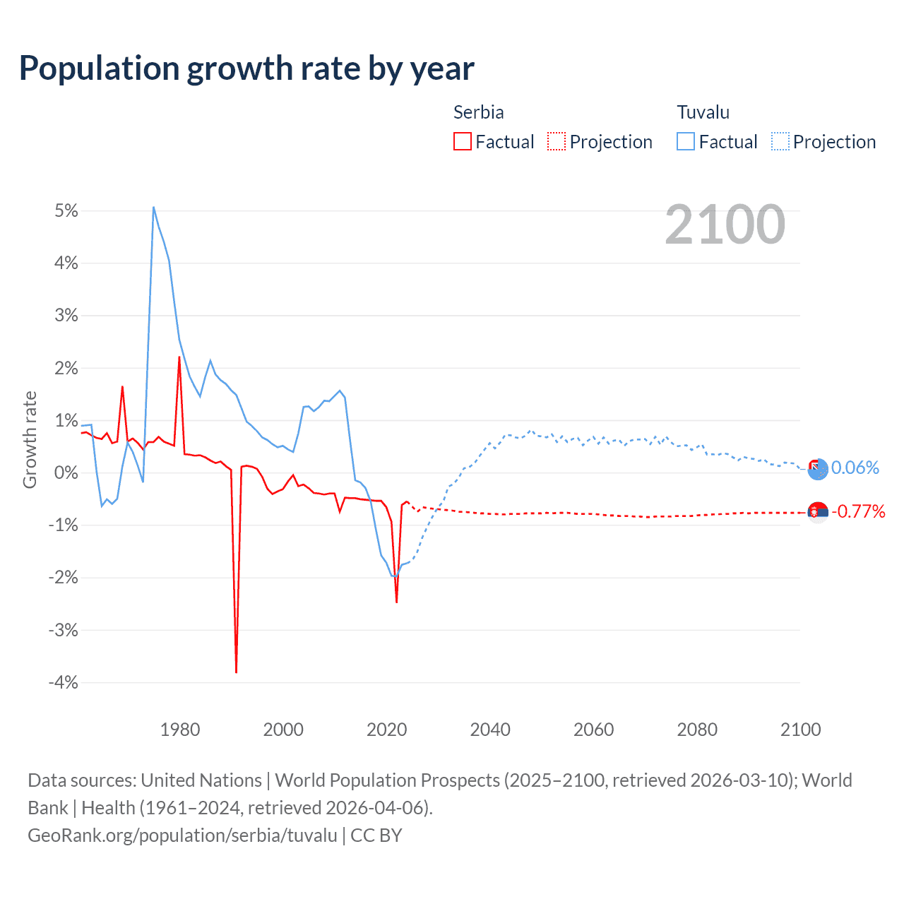 - For the last 10 years, Serbia has had an average growth rate of -0.76% per year vs -1.19% in Tuvalu.