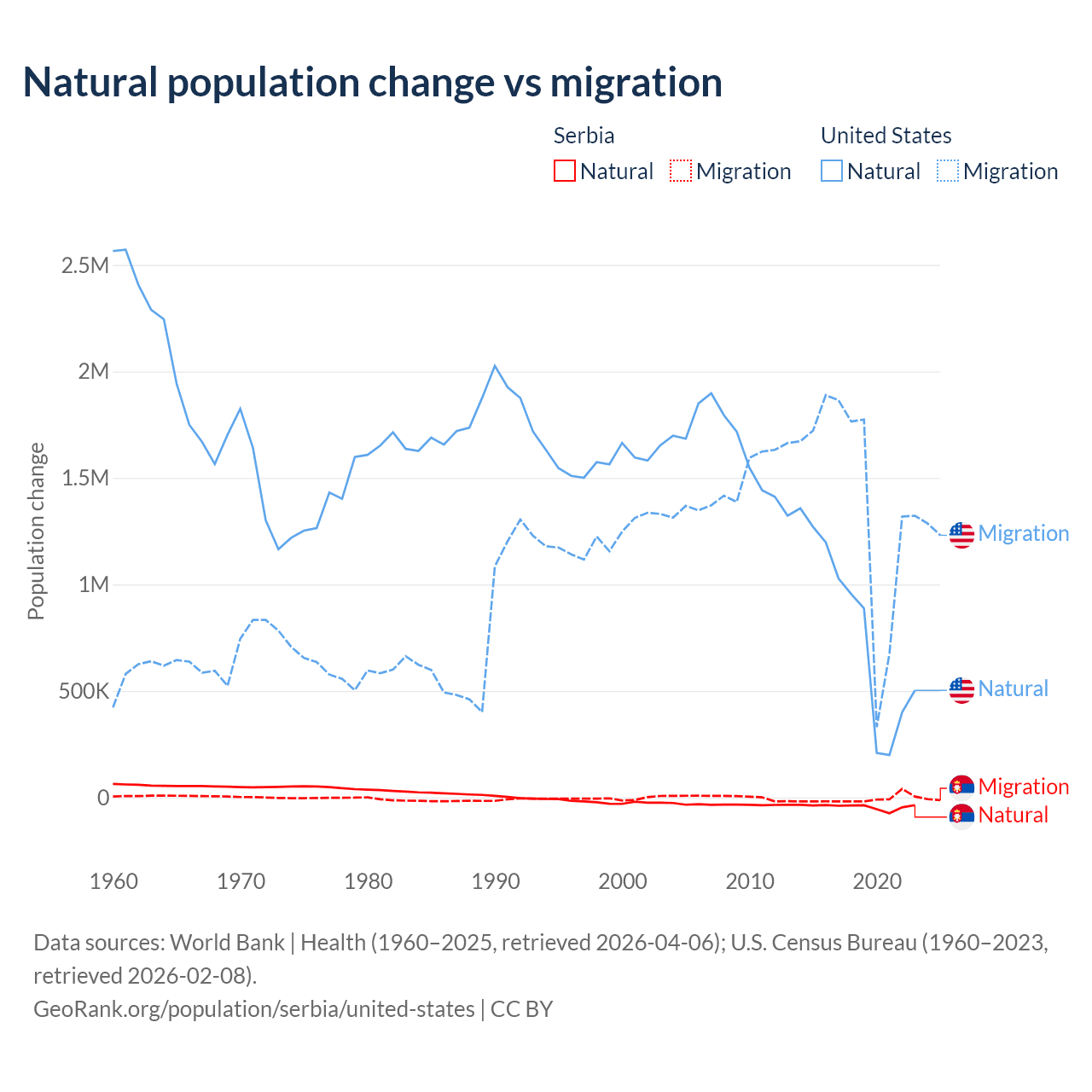 Over the last 10 years, 83.3% of the population change in Serbia is from natural causes (a loss of 435,148 people) and 16.7% is from migration (a loss of 87,110 people). In the United States 35.8% is from natural causes (a gain of 8,005,866 people) and 64.2% is from migration (a gain of 14,334,286 people).