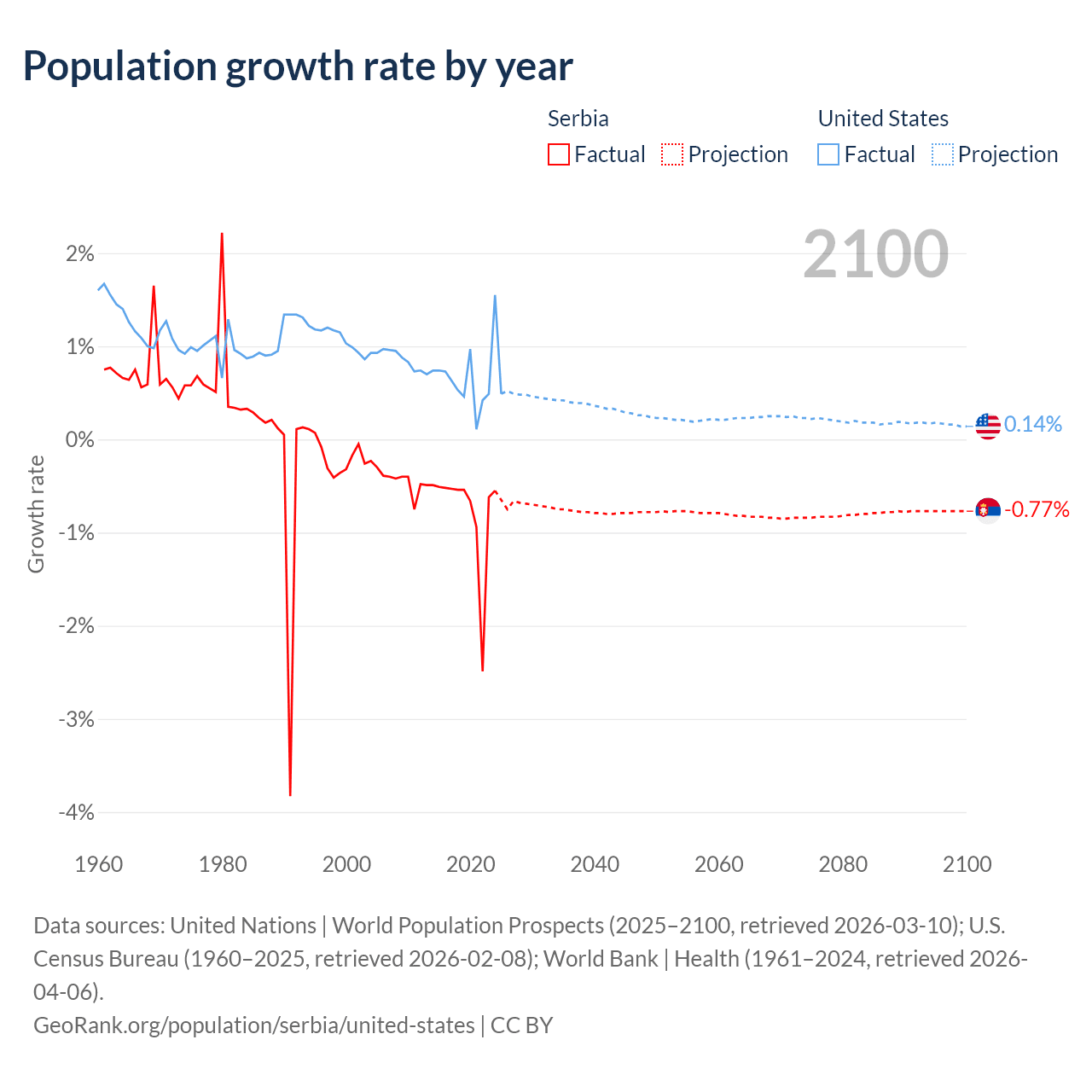 - For the last 10 years, Serbia has had an average growth rate of -0.76% per year vs +0.65% in the United States.