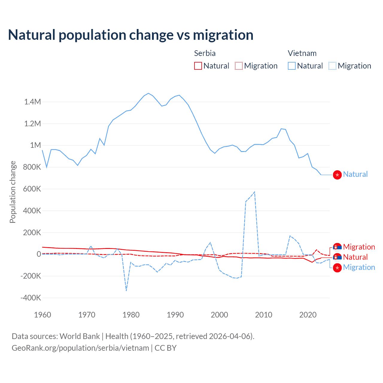 Over the last 10 years, 83.3% of the population change in Serbia is from natural causes (a loss of 435,148 people) and 16.7% is from migration (a loss of 87,110 people). In Vietnam 97.7% is from natural causes (a gain of 9,349,756 people) and 2.29% is from migration (a gain of 219,073 people).