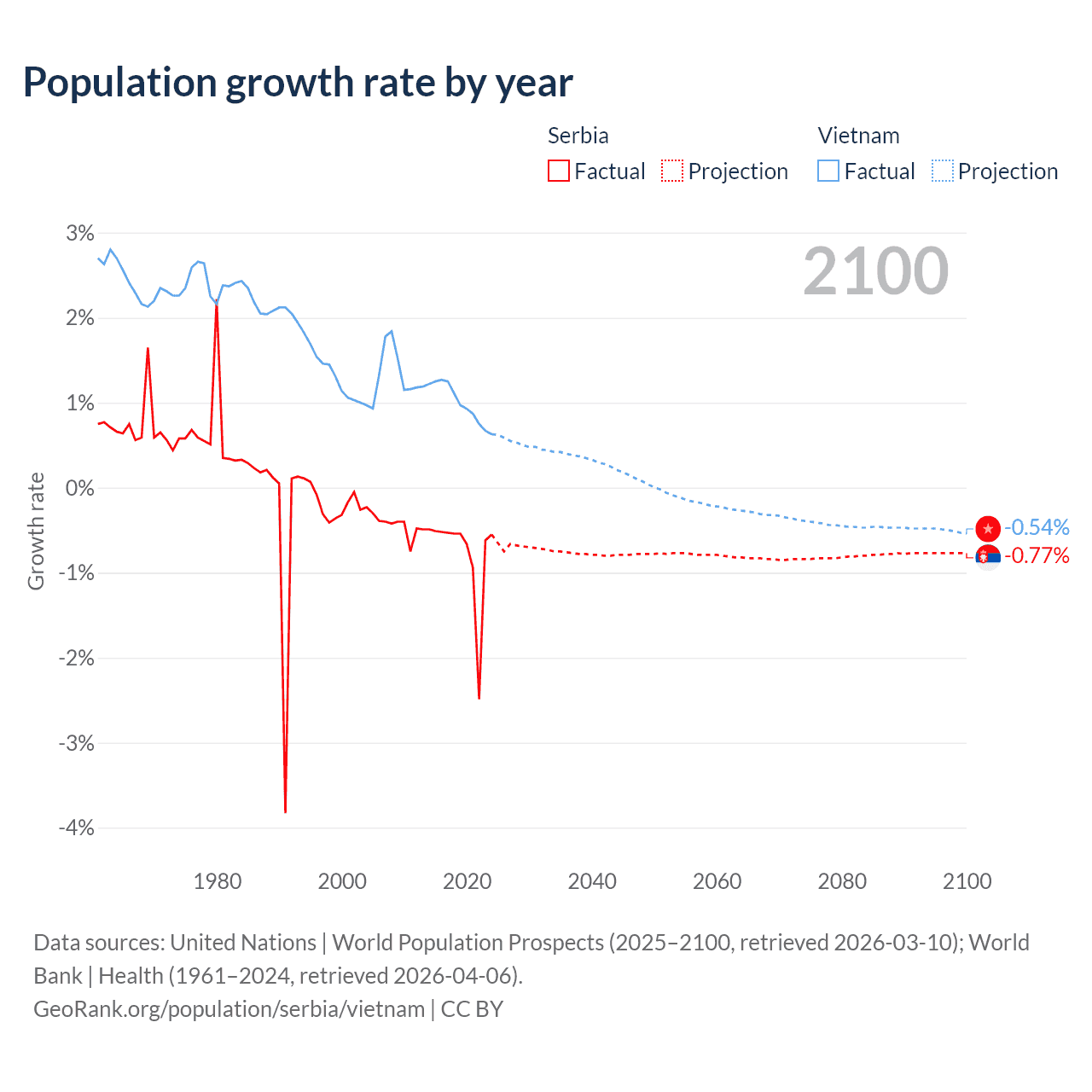 - For the last 10 years, Serbia has had an average growth rate of -0.76% per year vs +0.99% in Vietnam.