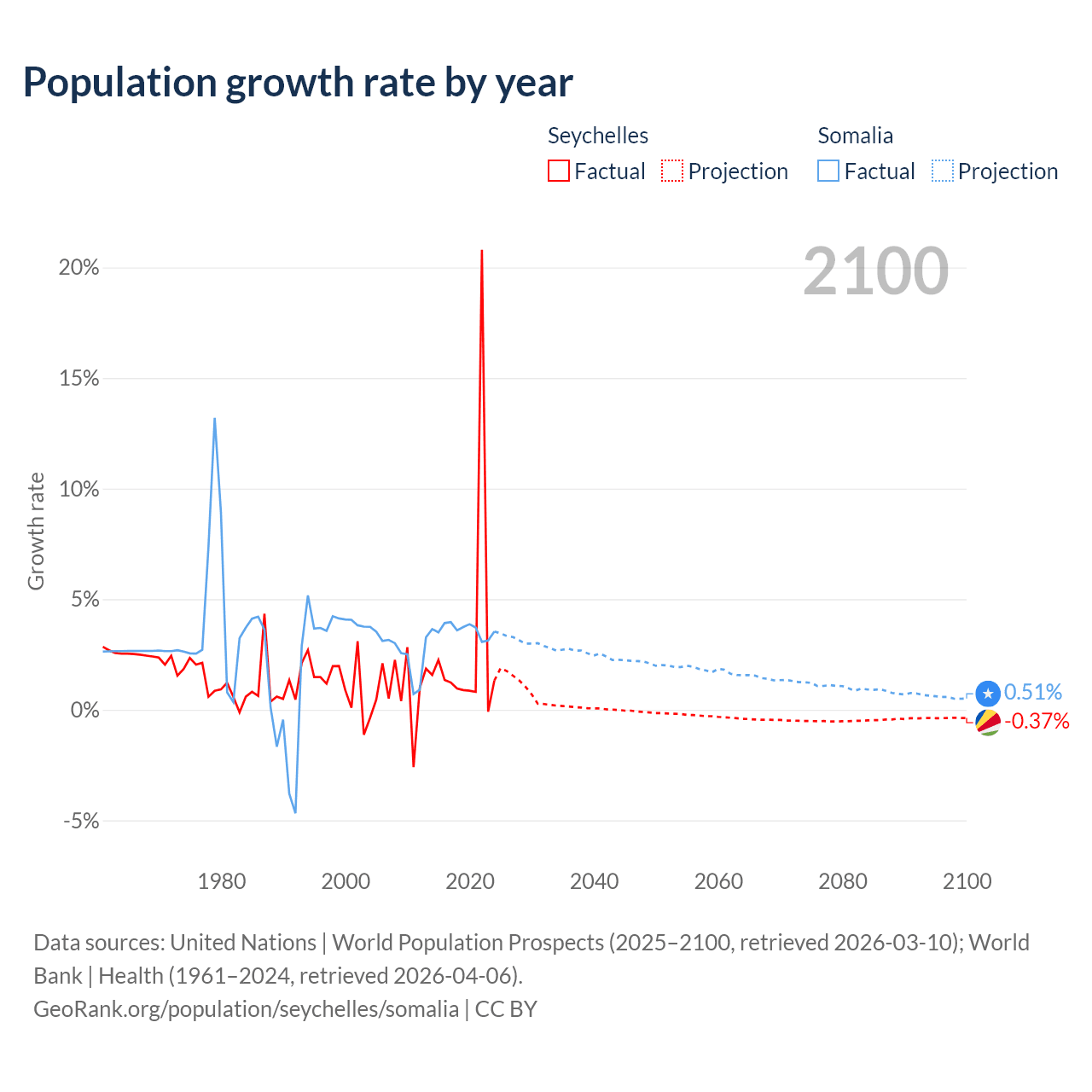 - For the last 10 years, the Seychelles has had an average growth rate of +2.9% per year vs +3.61% in Somalia.
