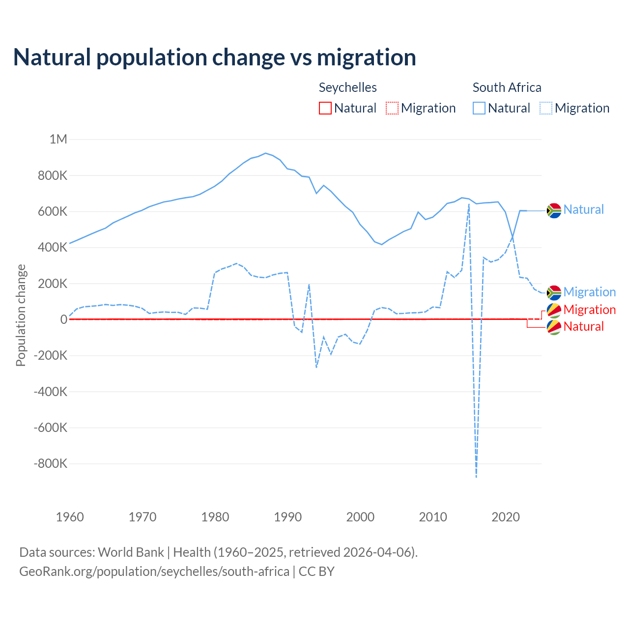 Over the last 10 years, 31.4% of the population change in the Seychelles is from natural causes (a gain of 8,122 people) and 68.6% is from migration (a gain of 17,748 people). In South Africa 72.8% is from natural causes (a gain of 6,190,027 people) and 27.2% is from migration (a gain of 2,316,795 people).