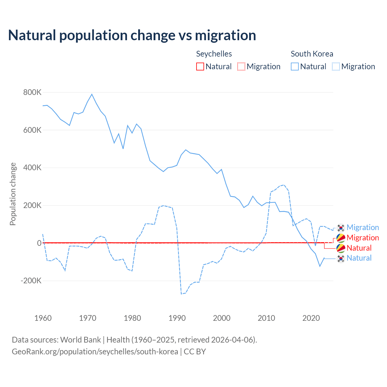 Over the last 10 years, 31.4% of the population change in the Seychelles is from natural causes (a gain of 8,122 people) and 68.6% is from migration (a gain of 17,748 people). In South Korea 17.6% is from natural causes (a gain of 277,215 people) and 82.4% is from migration (a gain of 1,298,356 people).