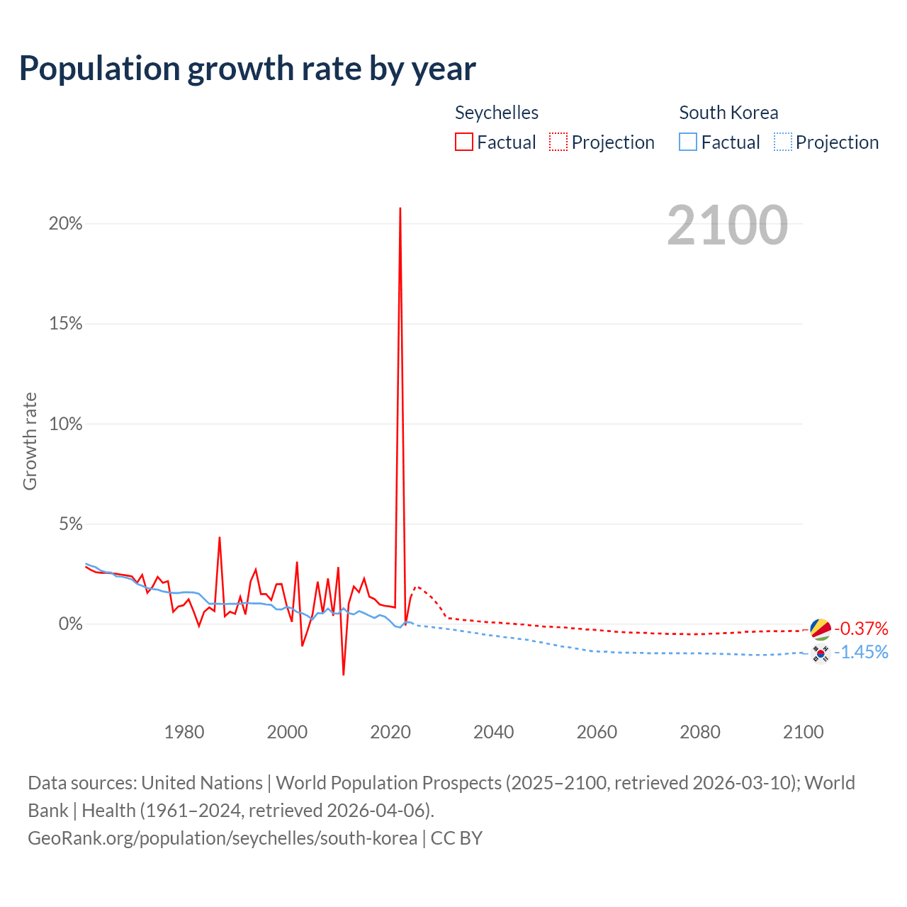 - For the last 10 years, the Seychelles has had an average growth rate of +2.9% per year vs +0.24% in South Korea.