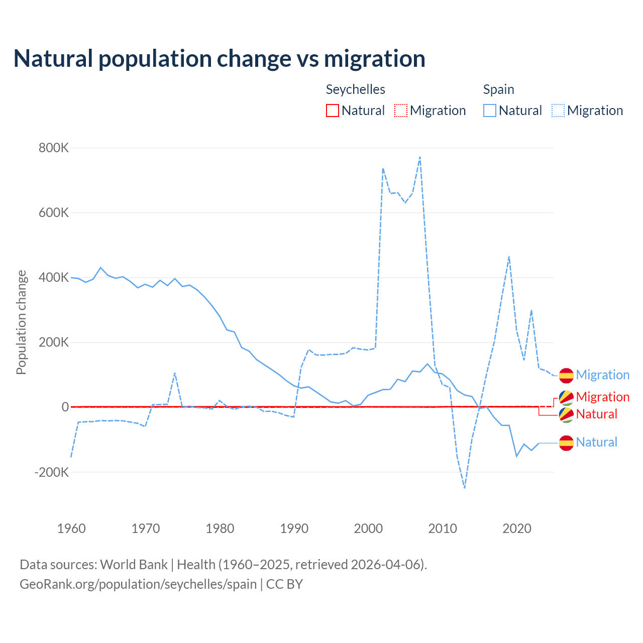 Over the last 10 years, 31.4% of the population change in the Seychelles is from natural causes (a gain of 8,122 people) and 68.6% is from migration (a gain of 17,748 people). In Spain 25.8% is from natural causes (a loss of 627,829 people) and 74.2% is from migration (a gain of 1,810,127 people).