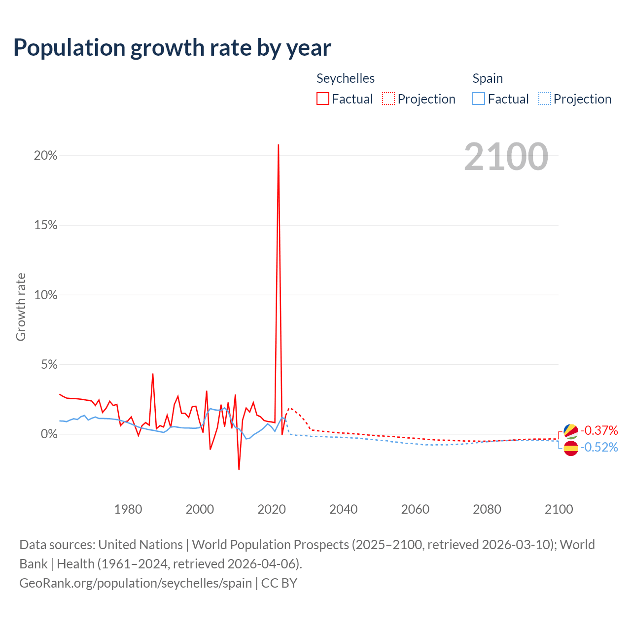 - For the last 10 years, the Seychelles has had an average growth rate of +2.9% per year vs +0.43% in Spain.