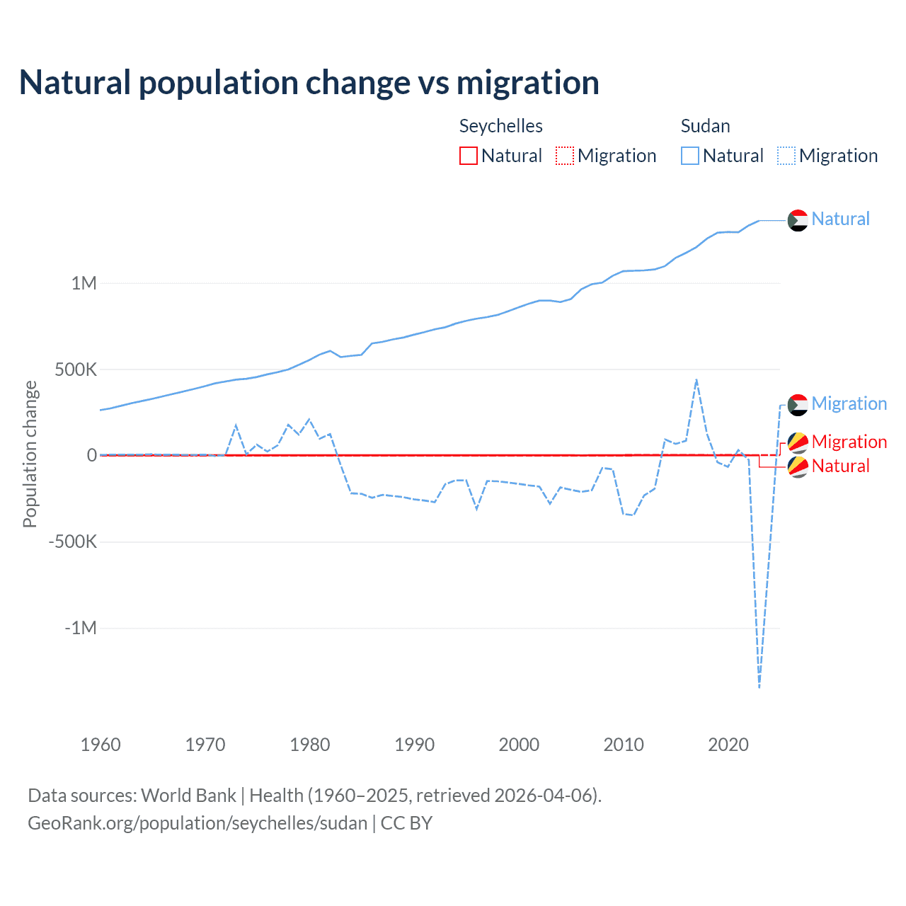 Over the last 10 years, 31.4% of the population change in the Seychelles is from natural causes (a gain of 8,122 people) and 68.6% is from migration (a gain of 17,748 people). In Sudan 95.1% is from natural causes (a gain of 12,459,977 people) and 4.88% is from migration (a loss of 639,596 people).