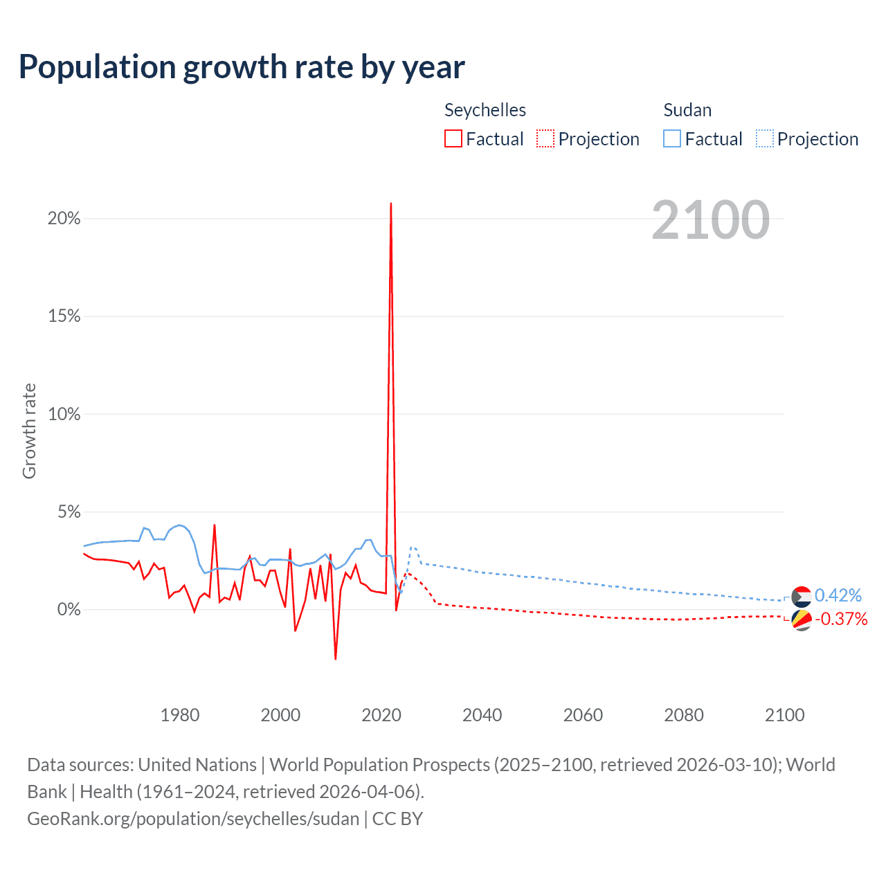 - For the last 10 years, the Seychelles has had an average growth rate of +2.9% per year vs +2.67% in Sudan.