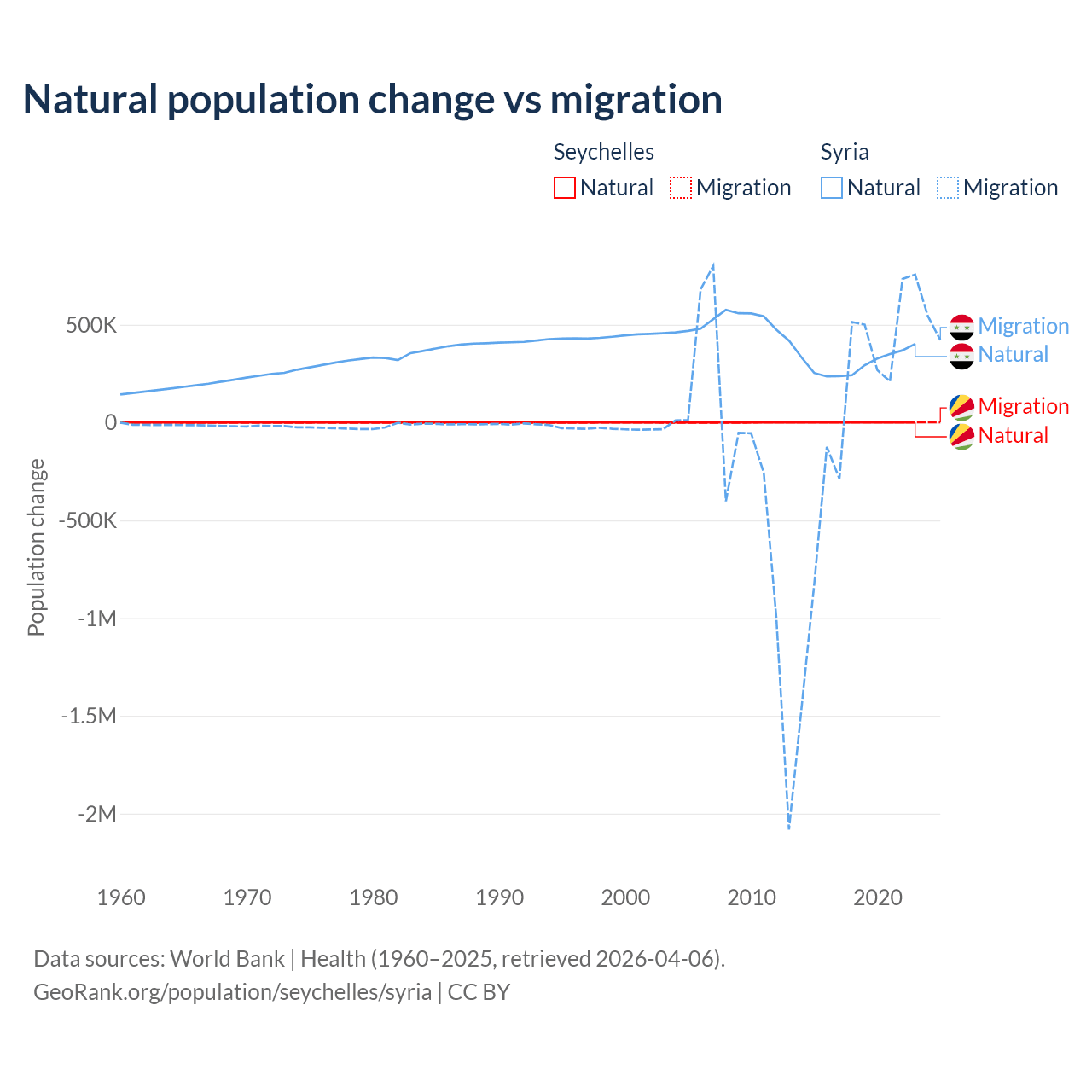 Over the last 10 years, 31.4% of the population change in the Seychelles is from natural causes (a gain of 8,122 people) and 68.6% is from migration (a gain of 17,748 people). In Syria 91.3% is from natural causes (a gain of 3,047,621 people) and 8.72% is from migration (a gain of 291,069 people).