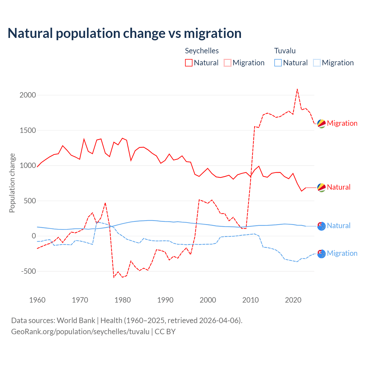 Over the last 10 years, 31.4% of the population change in the Seychelles is from natural causes (a gain of 8,122 people) and 68.6% is from migration (a gain of 17,748 people). In Tuvalu 35.5% is from natural causes (a gain of 1,556 people) and 64.5% is from migration (a loss of 2,827 people).