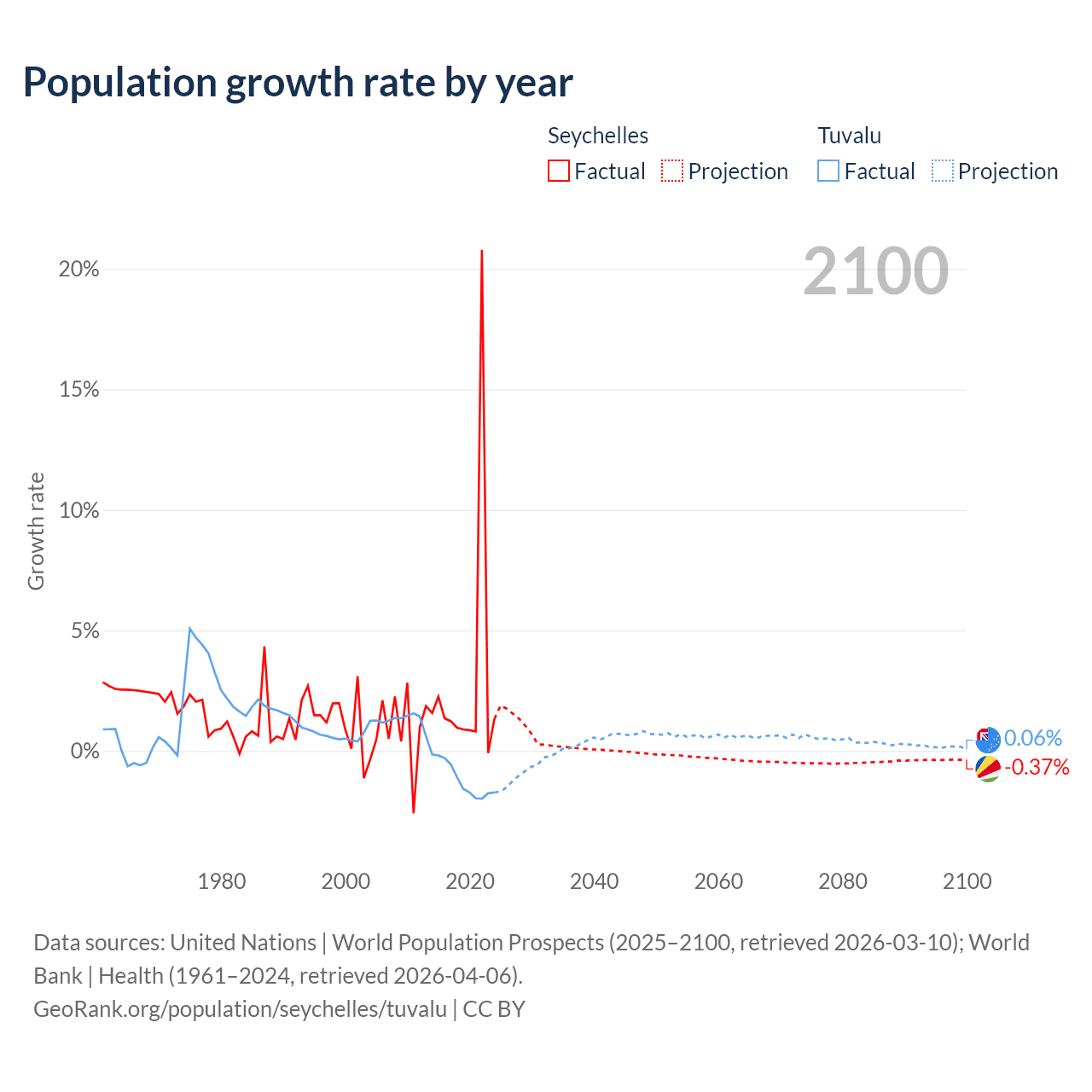 - For the last 10 years, the Seychelles has had an average growth rate of +2.9% per year vs -1.19% in Tuvalu.