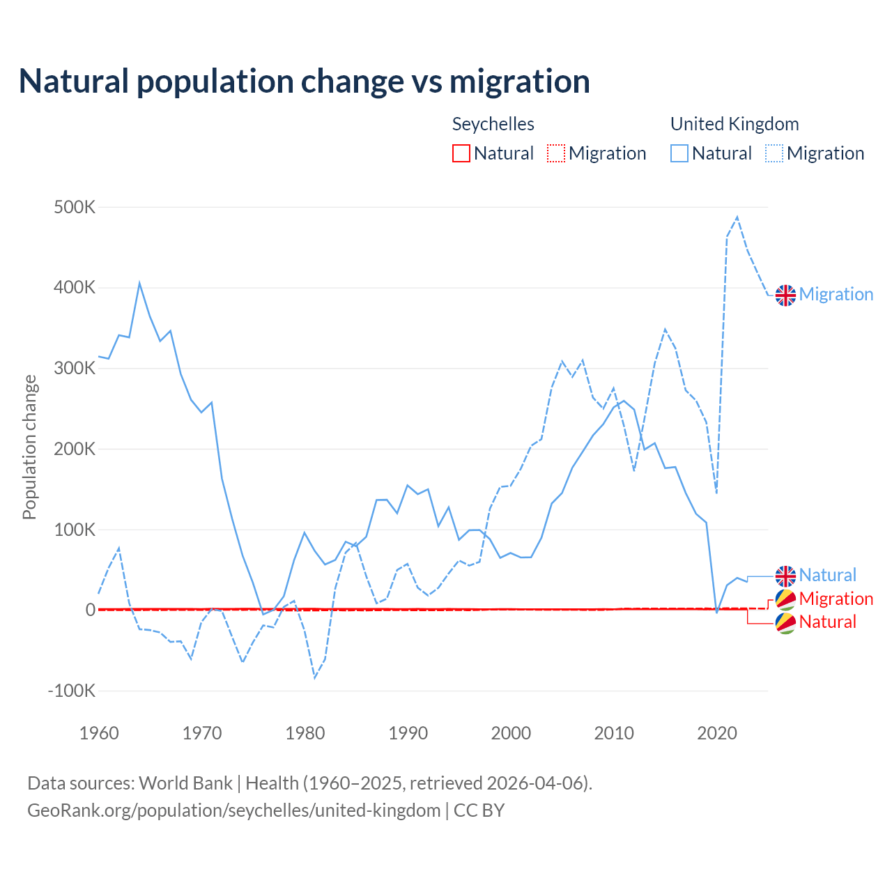 Over the last 10 years, 31.4% of the population change in the Seychelles is from natural causes (a gain of 8,122 people) and 68.6% is from migration (a gain of 17,748 people). In the United Kingdom 23.9% is from natural causes (a gain of 1,033,129 people) and 76.1% is from migration (a gain of 3,283,101 people).