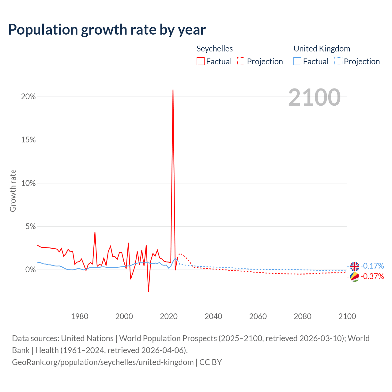 - For the last 10 years, the Seychelles has had an average growth rate of +2.9% per year vs +0.7% in the United Kingdom.