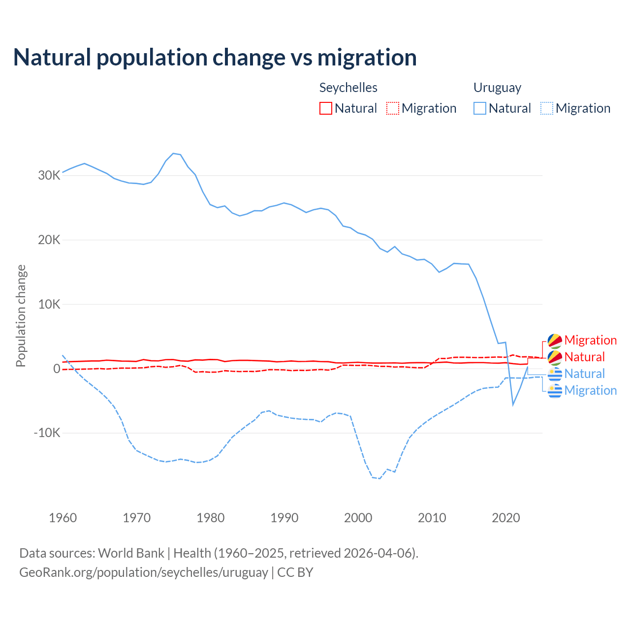 Over the last 10 years, 31.4% of the population change in the Seychelles is from natural causes (a gain of 8,122 people) and 68.6% is from migration (a gain of 17,748 people). In Uruguay 70% is from natural causes (a gain of 64,303 people) and 30% is from migration (a loss of 27,501 people).
