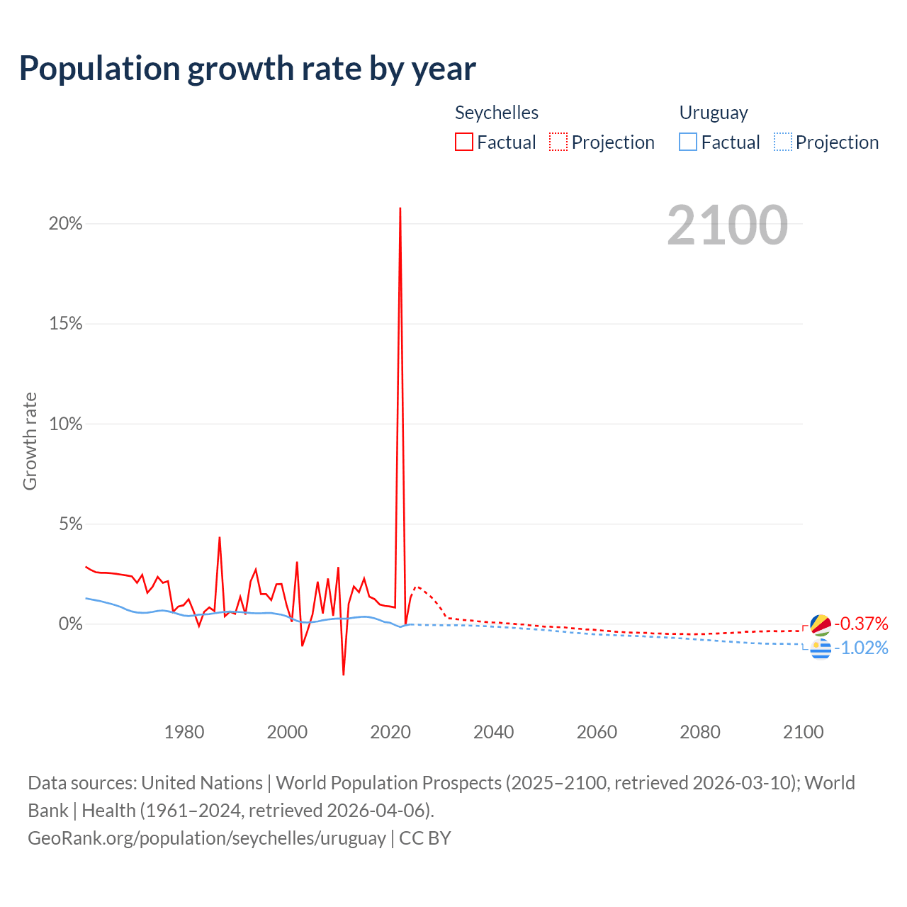 - For the last 10 years, the Seychelles has had an average growth rate of +2.9% per year vs +0.11% in Uruguay.
