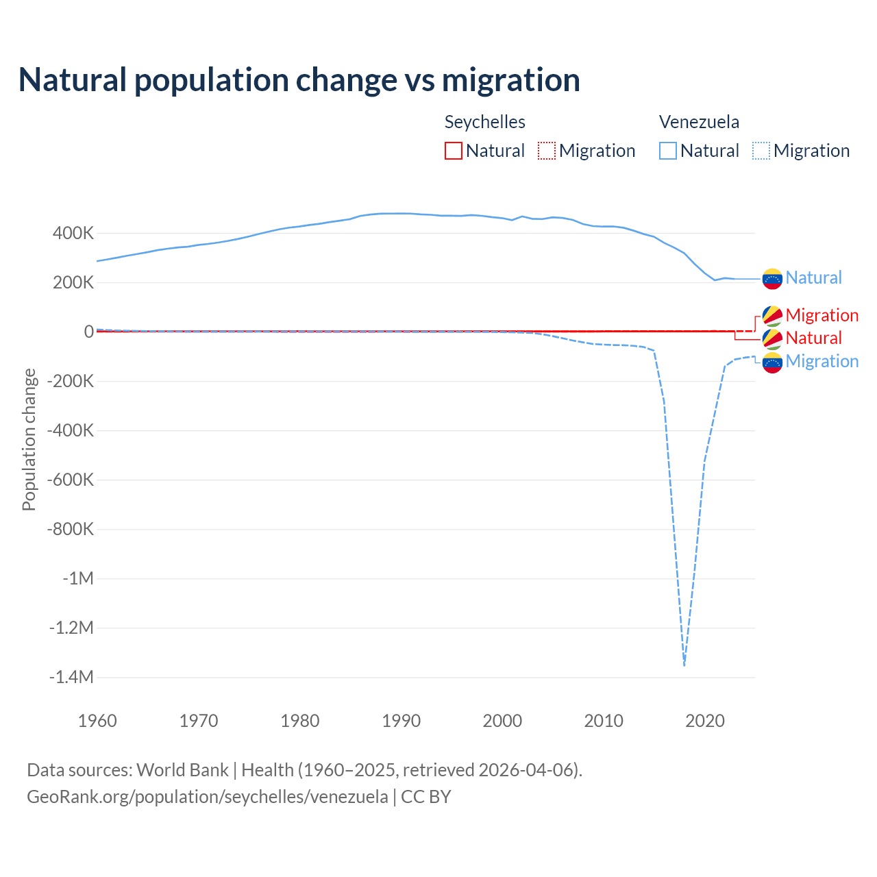 Over the last 10 years, 31.4% of the population change in the Seychelles is from natural causes (a gain of 8,122 people) and 68.6% is from migration (a gain of 17,748 people). In Venezuela 38.6% is from natural causes (a gain of 2,946,257 people) and 61.4% is from migration (a loss of 4,683,227 people).