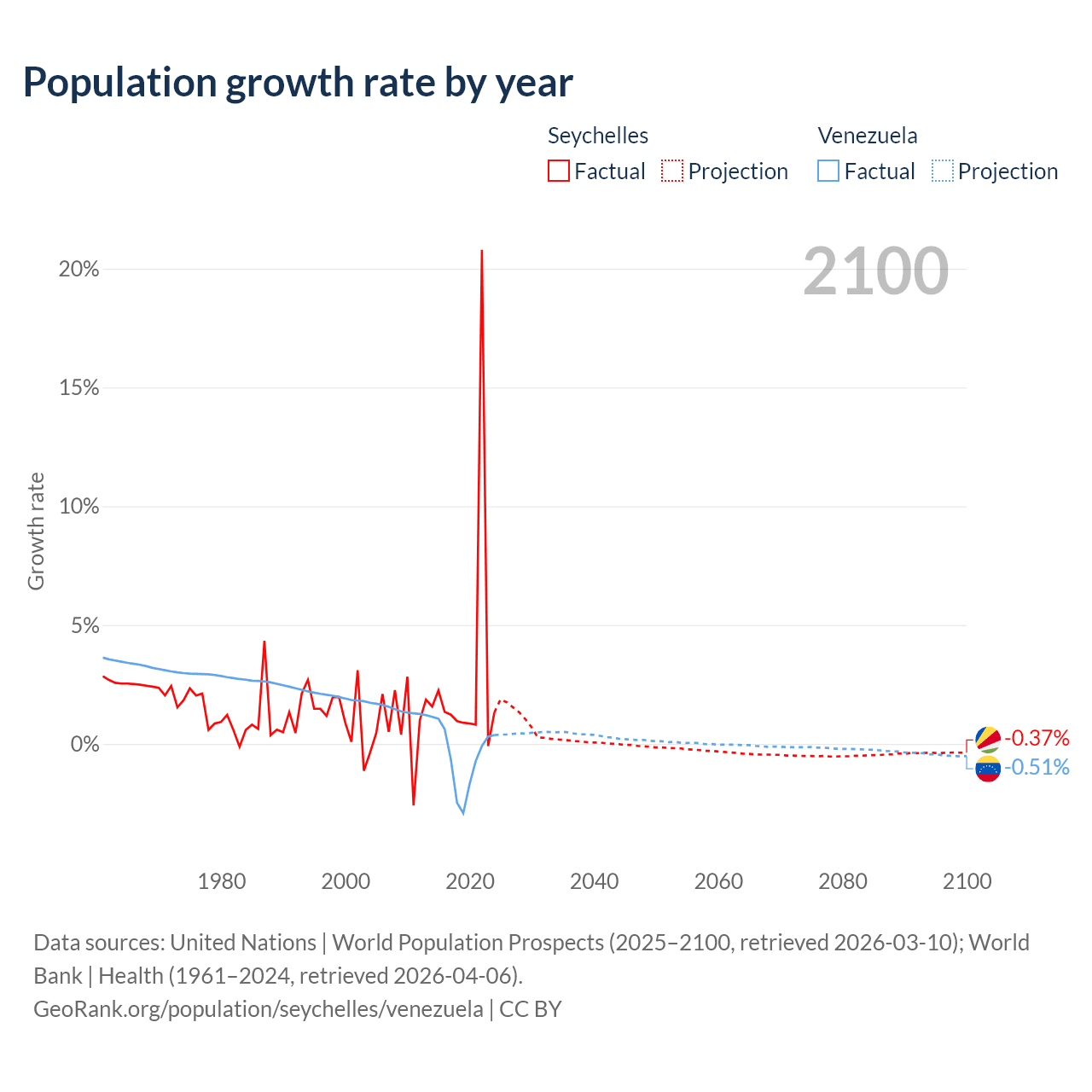 - For the last 10 years, the Seychelles has had an average growth rate of +2.9% per year vs -0.46% in Venezuela.
