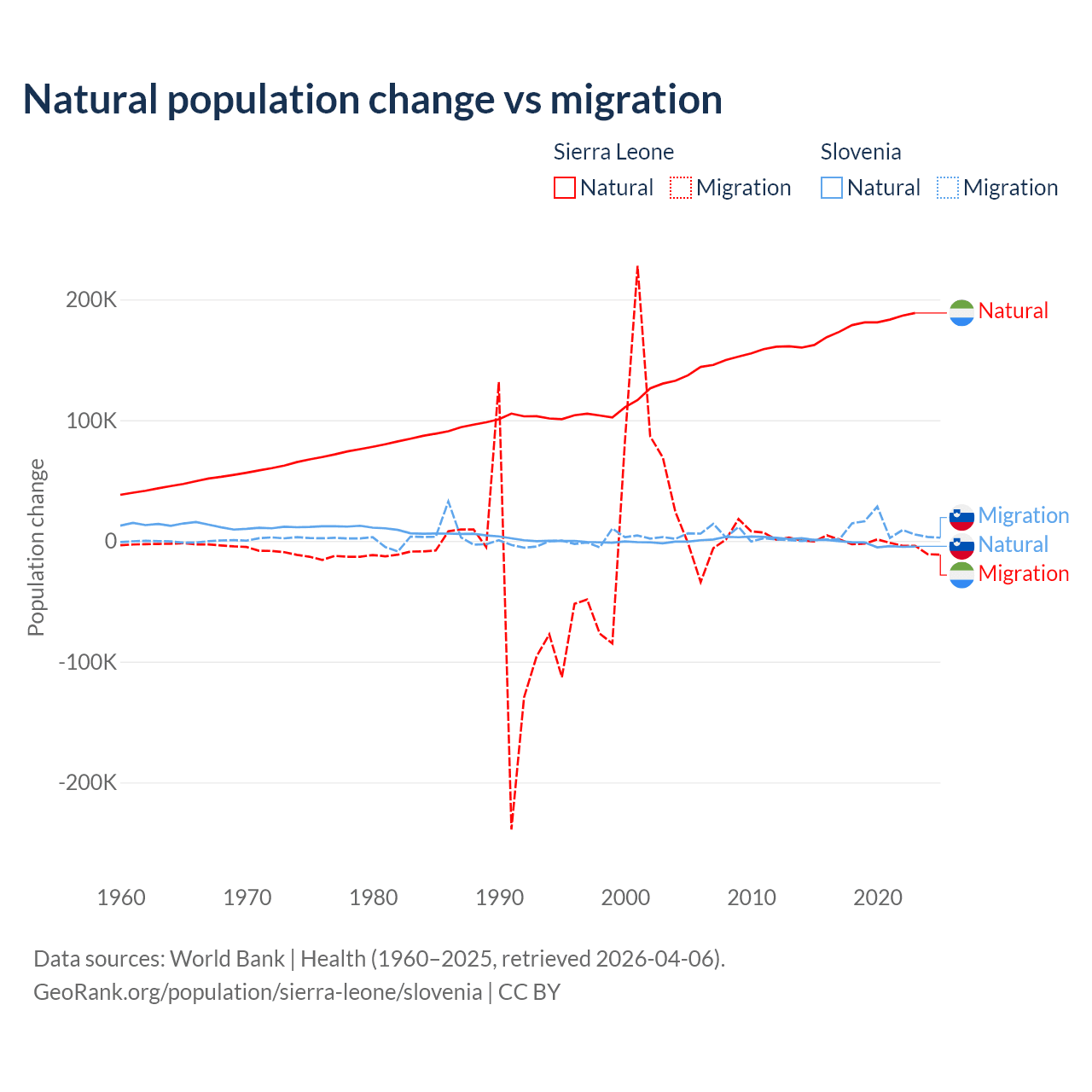 Over the last 10 years, 99.6% of the population change in Sierra Leone is from natural causes (a gain of 1,764,049 people) and 0.41% is from migration (a loss of 7,211 people). In Slovenia 18.1% is from natural causes (a loss of 17,573 people) and 81.9% is from migration (a gain of 79,532 people).