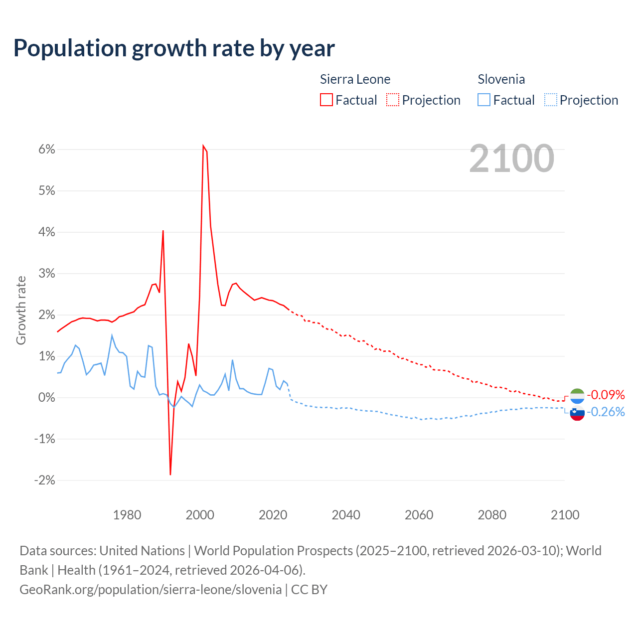 - For the last 10 years, Sierra Leone has had an average growth rate of +2.32% per year vs +0.29% in Slovenia.