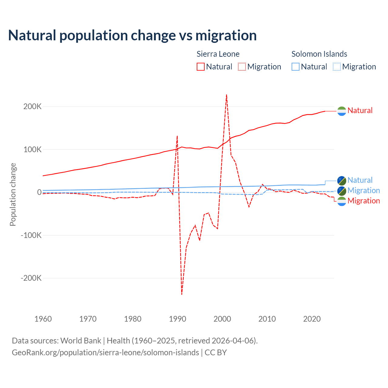 Over the last 10 years, 99.6% of the population change in Sierra Leone is from natural causes (a gain of 1,764,049 people) and 0.41% is from migration (a loss of 7,211 people). In the Solomon Islands 82.8% is from natural causes (a gain of 168,727 people) and 17.2% is from migration (a gain of 35,031 people).