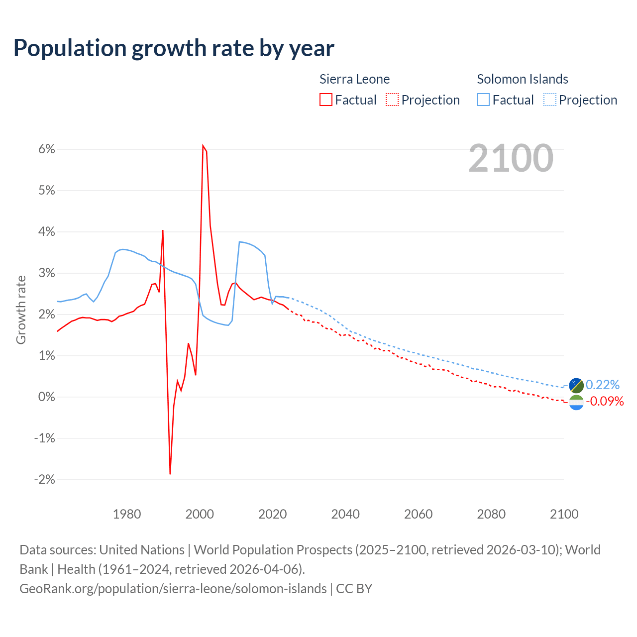 - For the last 10 years, Sierra Leone has had an average growth rate of +2.32% per year vs +2.95% in the Solomon Islands.