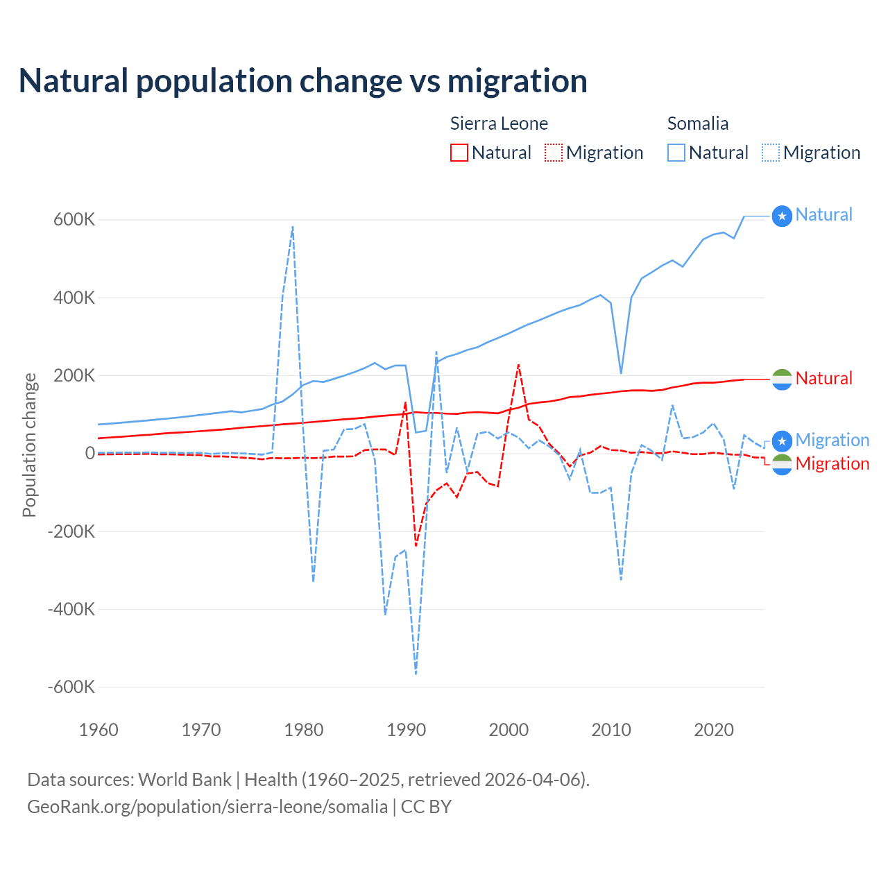 Over the last 10 years, 99.6% of the population change in Sierra Leone is from natural causes (a gain of 1,764,049 people) and 0.41% is from migration (a loss of 7,211 people). In Somalia 94.4% is from natural causes (a gain of 5,270,105 people) and 5.58% is from migration (a gain of 311,487 people).