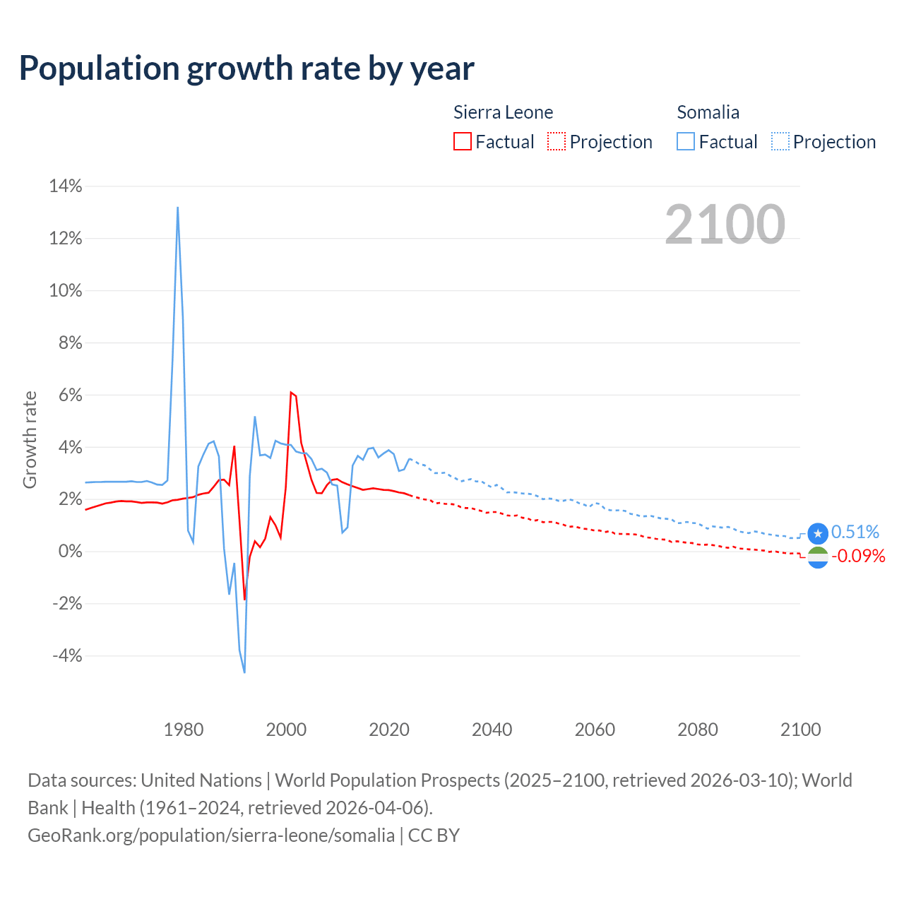 - For the last 10 years, Sierra Leone has had an average growth rate of +2.32% per year vs +3.61% in Somalia.