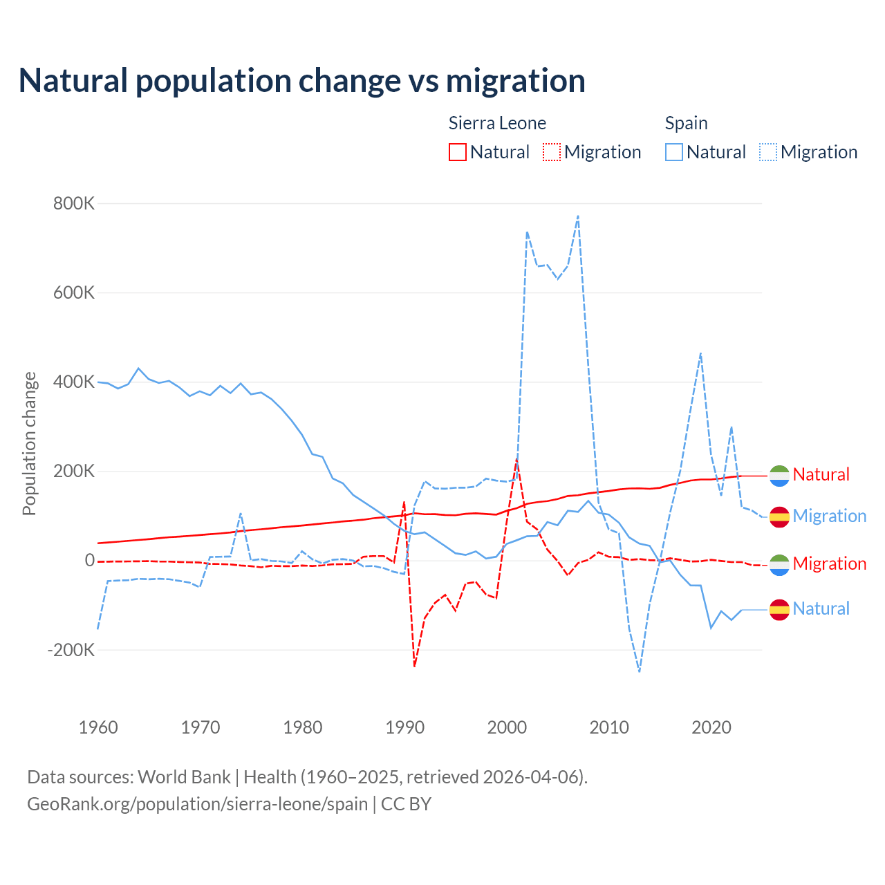 Over the last 10 years, 99.6% of the population change in Sierra Leone is from natural causes (a gain of 1,764,049 people) and 0.41% is from migration (a loss of 7,211 people). In Spain 25.8% is from natural causes (a loss of 627,829 people) and 74.2% is from migration (a gain of 1,810,127 people).