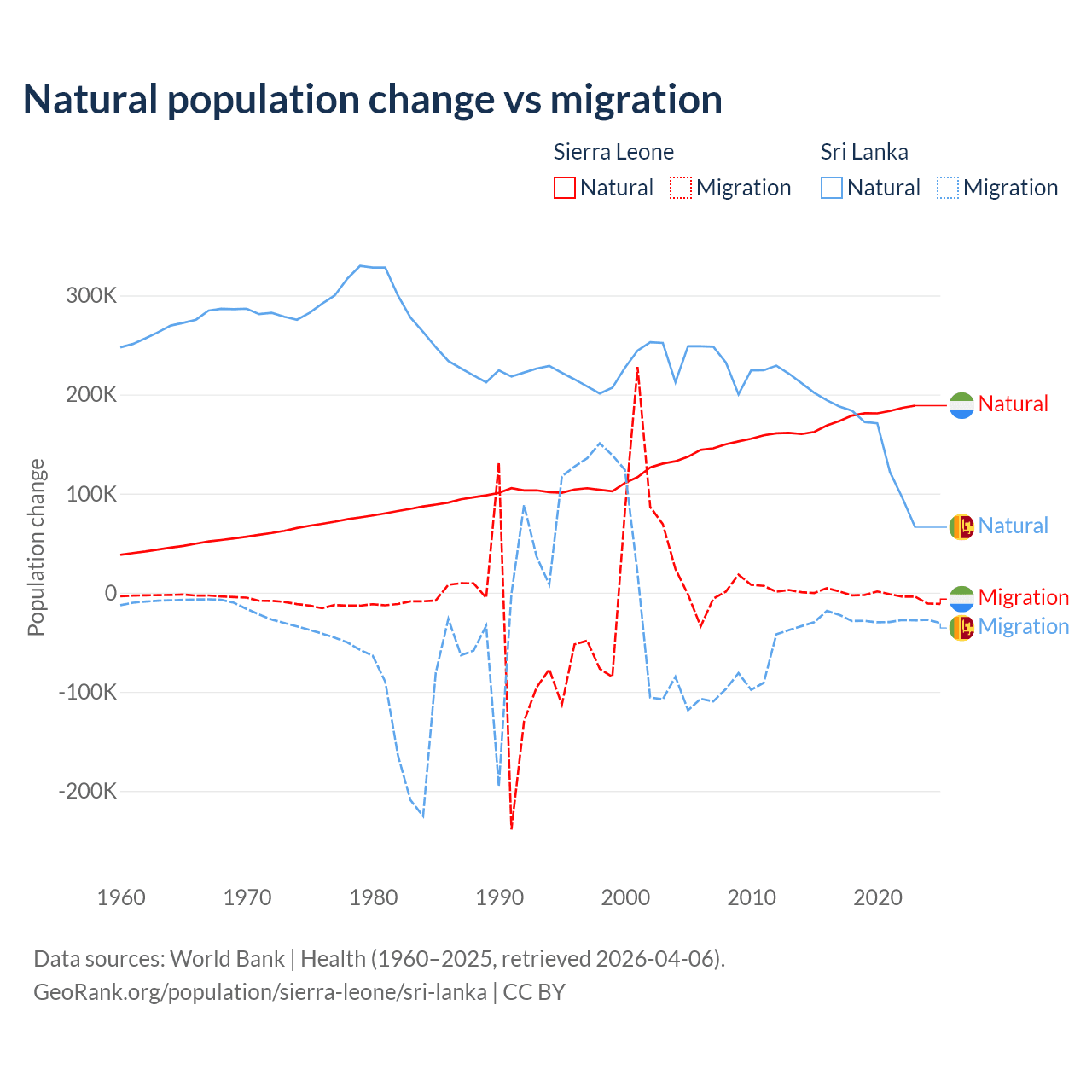 Over the last 10 years, 99.6% of the population change in Sierra Leone is from natural causes (a gain of 1,764,049 people) and 0.41% is from migration (a loss of 7,211 people). In Sri Lanka 85.3% is from natural causes (a gain of 1,605,749 people) and 14.7% is from migration (a loss of 276,121 people).